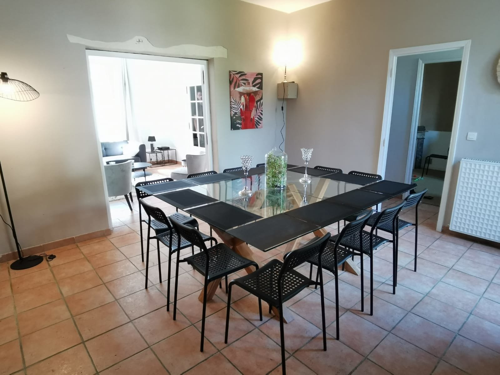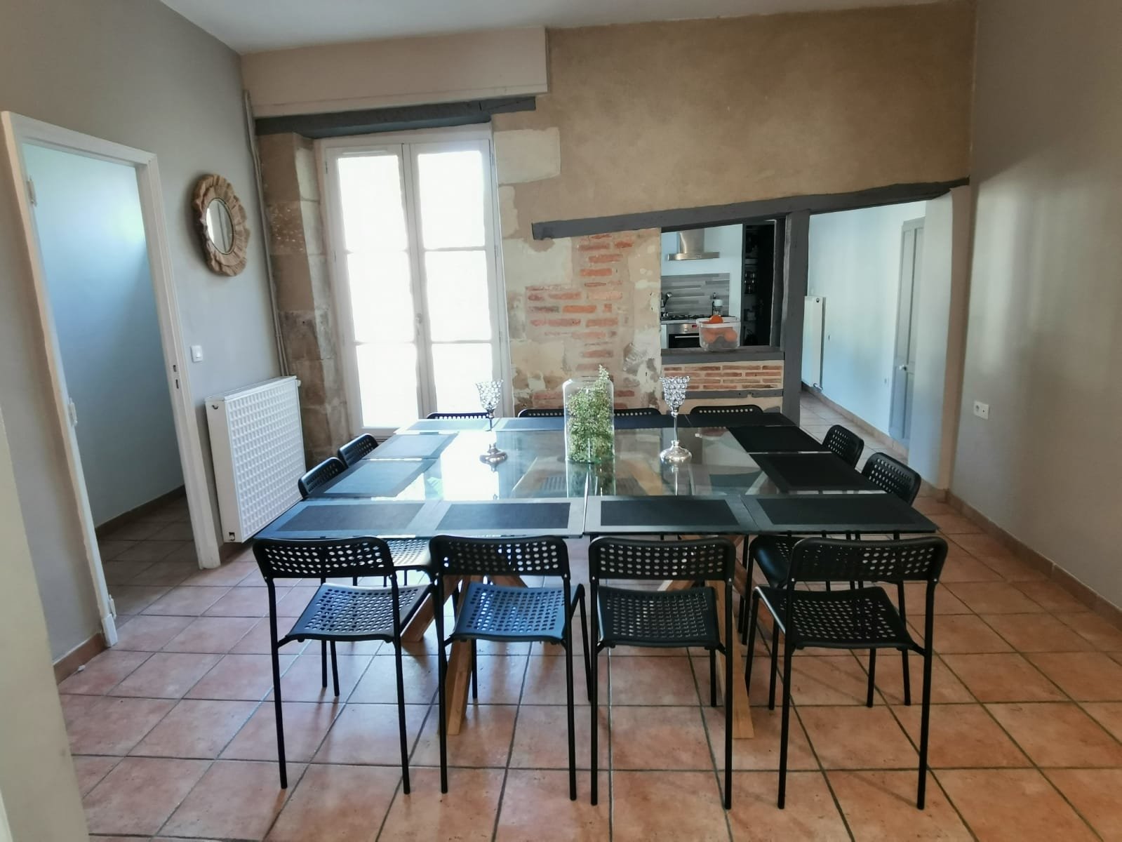 - une salle à manger carrelée avec un mur en pierres apparentes belle hauteur sous plafond,