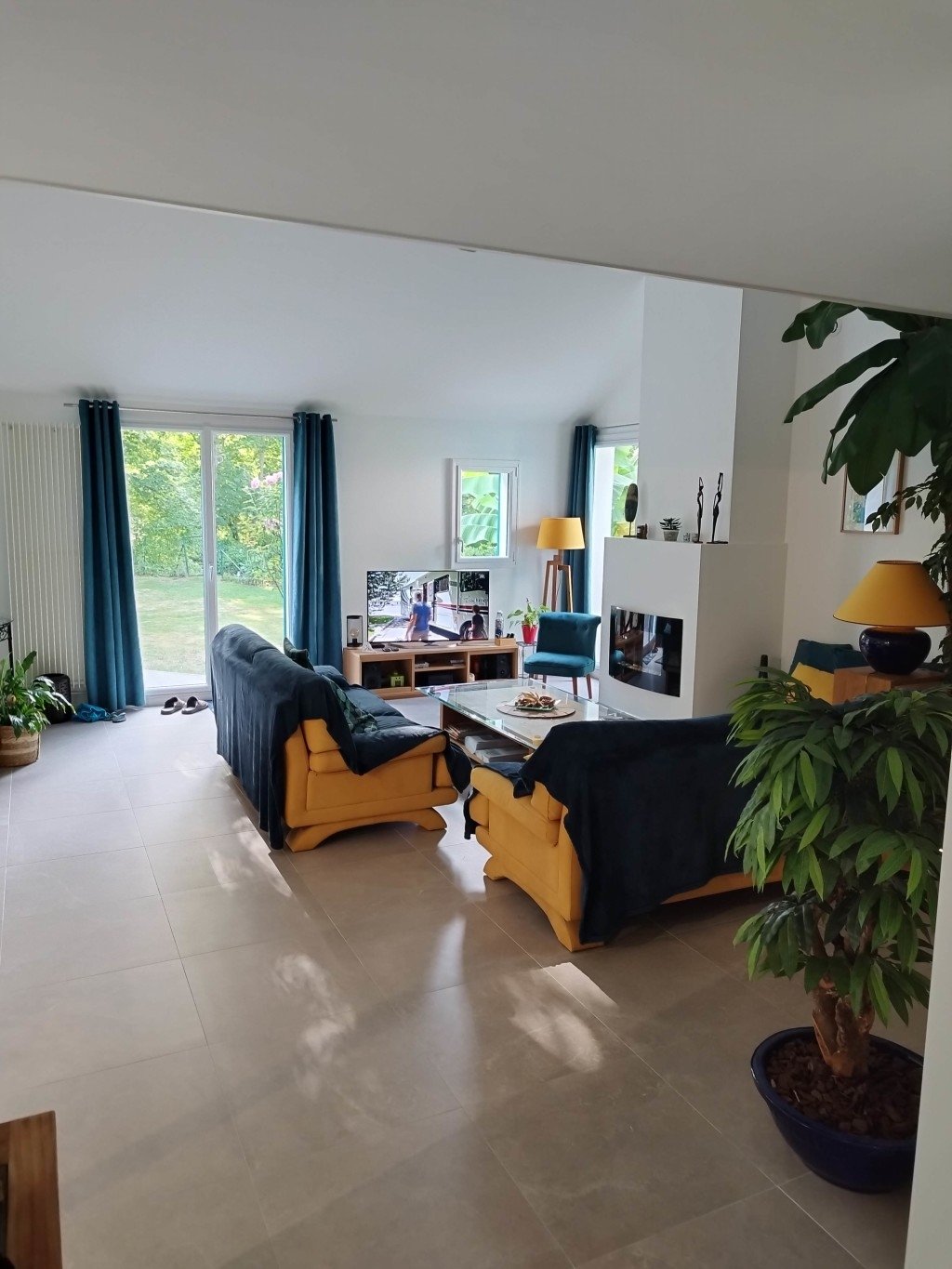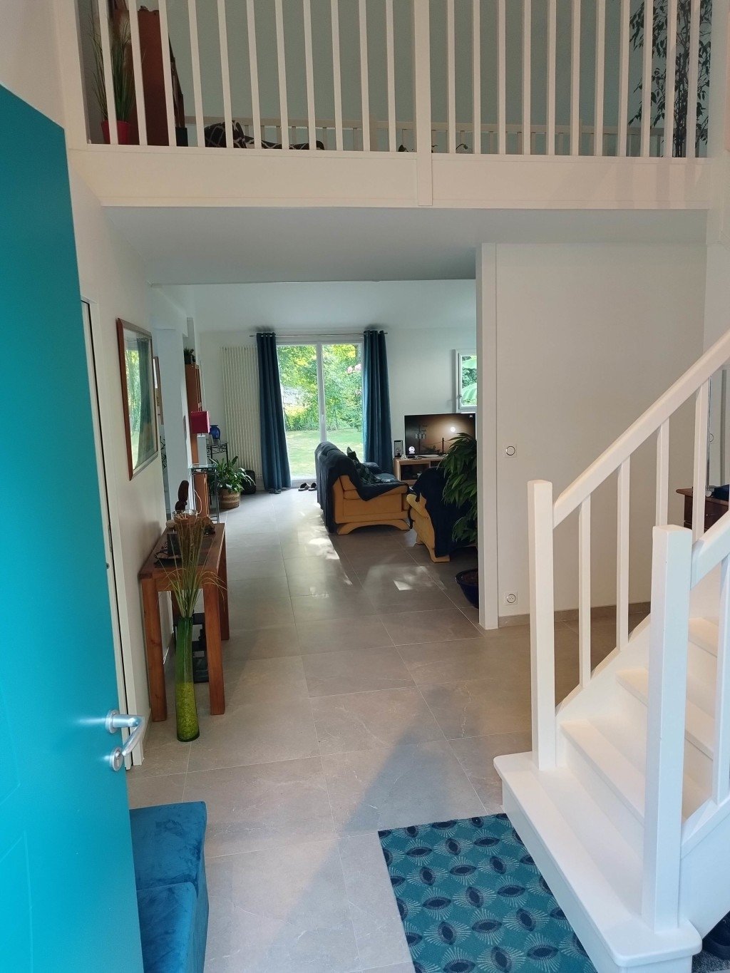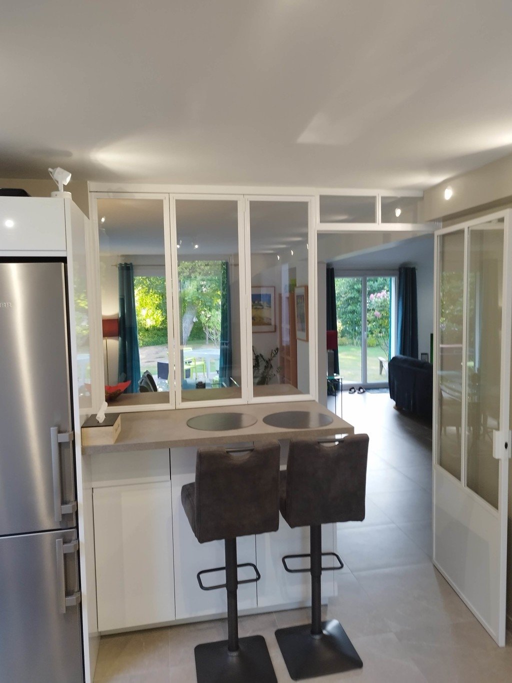 - Grand salon/salle à manger/cuisine de 75m² (cuisine ouverte/fermée par verrière accordéon style atelier) traversant et donnant sur terrasse/jardin/cours d'eau. Plafond cathédrale hauteur sous faîtage environ 7 mètres.