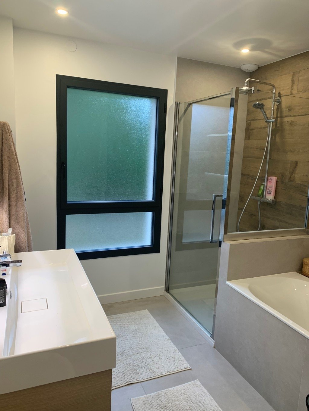 - Une grande salle de bain avec baignoire et douche.