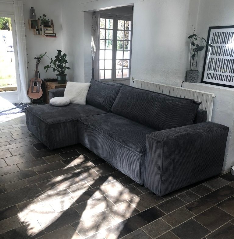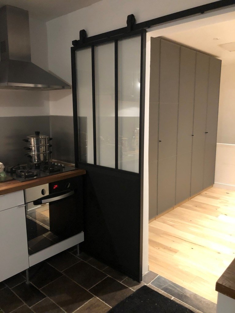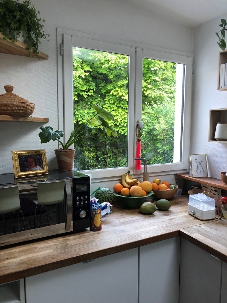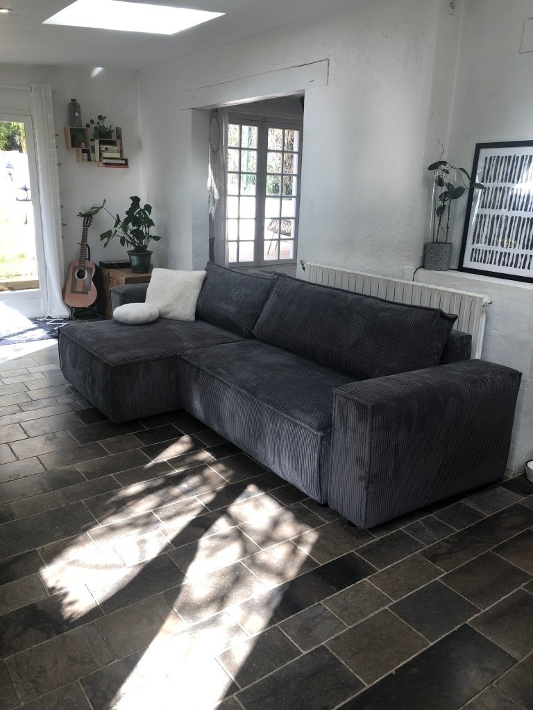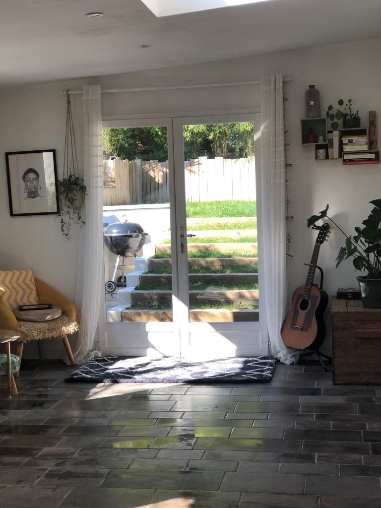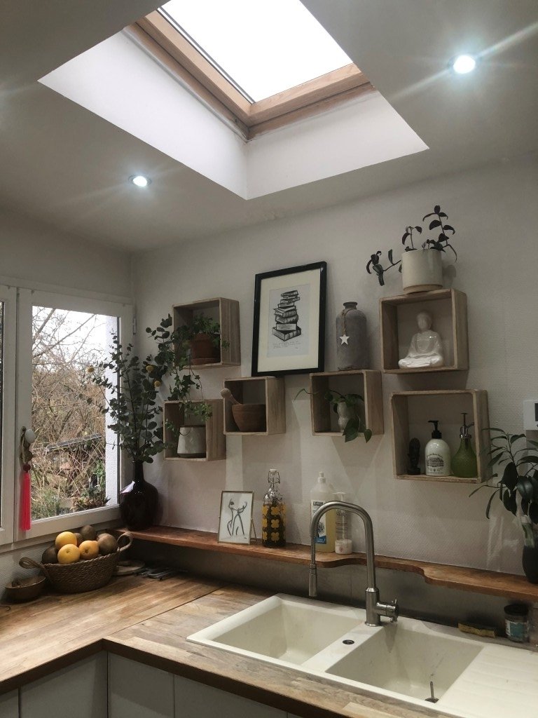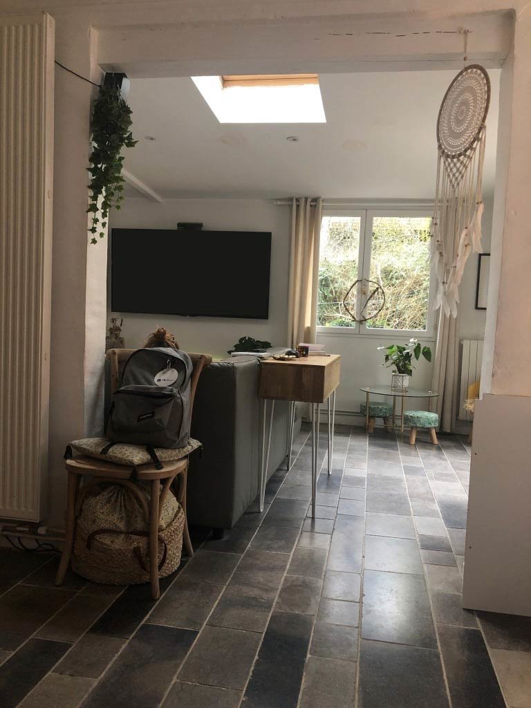 Pièce à vivre de 50 m² avec cuisine ouverte, lumineuse et traversante (3 velux, 2 fenêtres et 2 portes fenêtre).
