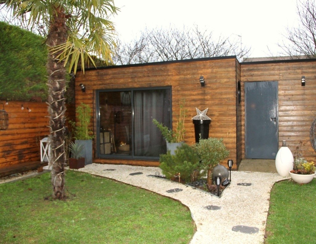 Un jardin avec une jolie terrasse en bois ambiance côte d'azur.