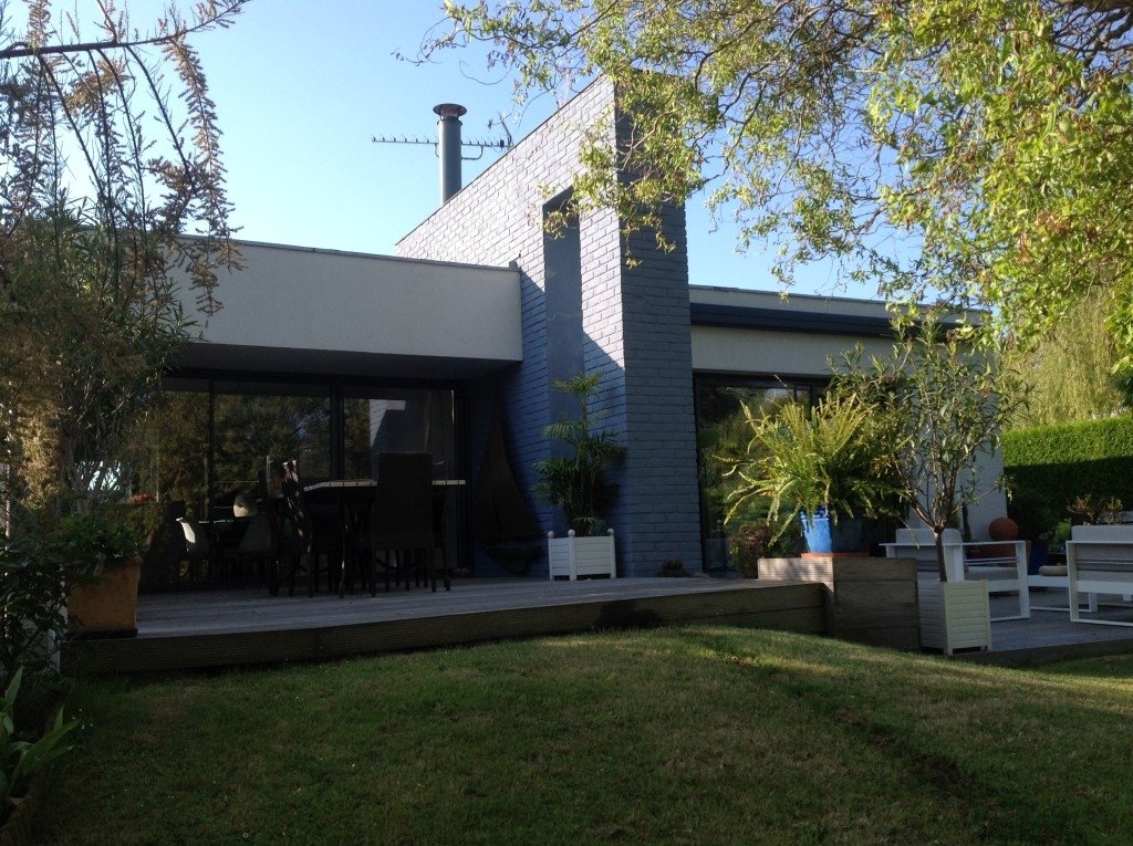 - salon 50m2 avec grandes baies vitrées ouvertes sur 100m2 terrasse teck dans jardin paysager
