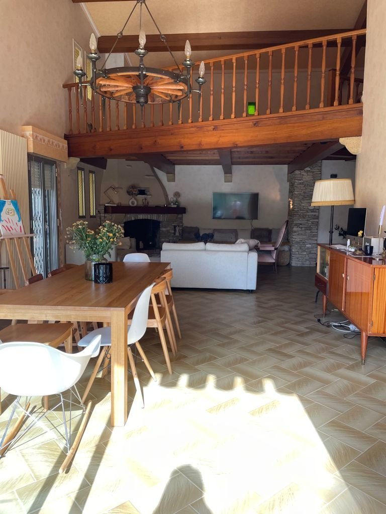 - salle à manger avec grande hauteur sous plafond et cheminée en pierre