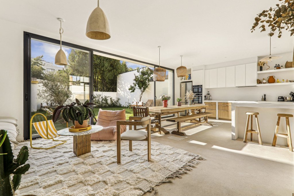 Grande Baie Vitrée : Une immense baie vitrée inonde l'intérieur de lumière naturelle et offre une vue sur le jardin.