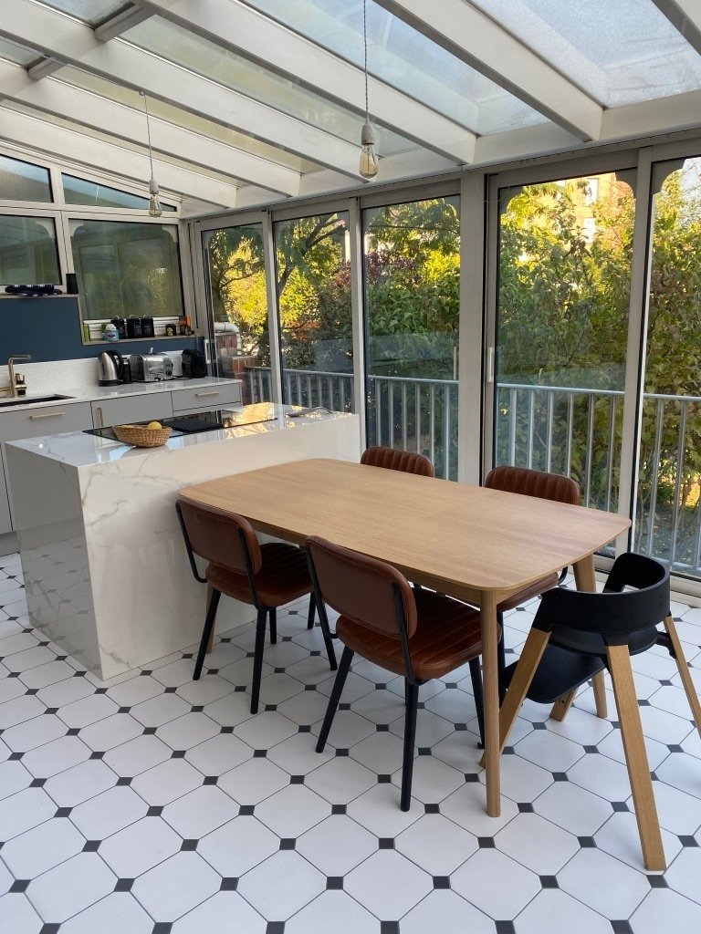 Un grand salon, salle à manger avec une bibliothèque de 45m², avec cheminée, attenant à une cuisine sous véranda de 20 m²