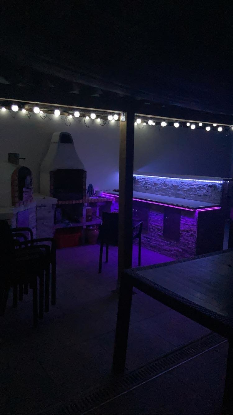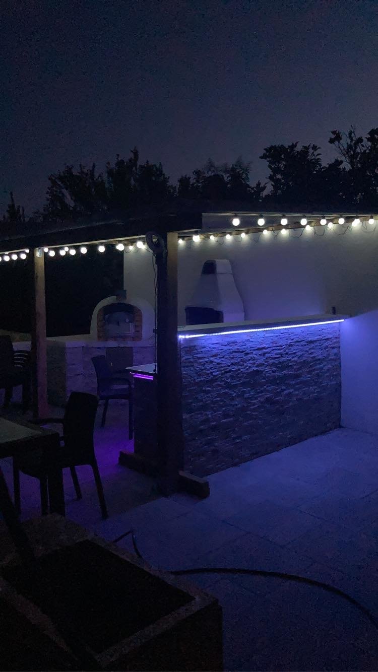 - cuisine d’été avec four à pizza traditionnel mixte, four en brique comptoirs et bar