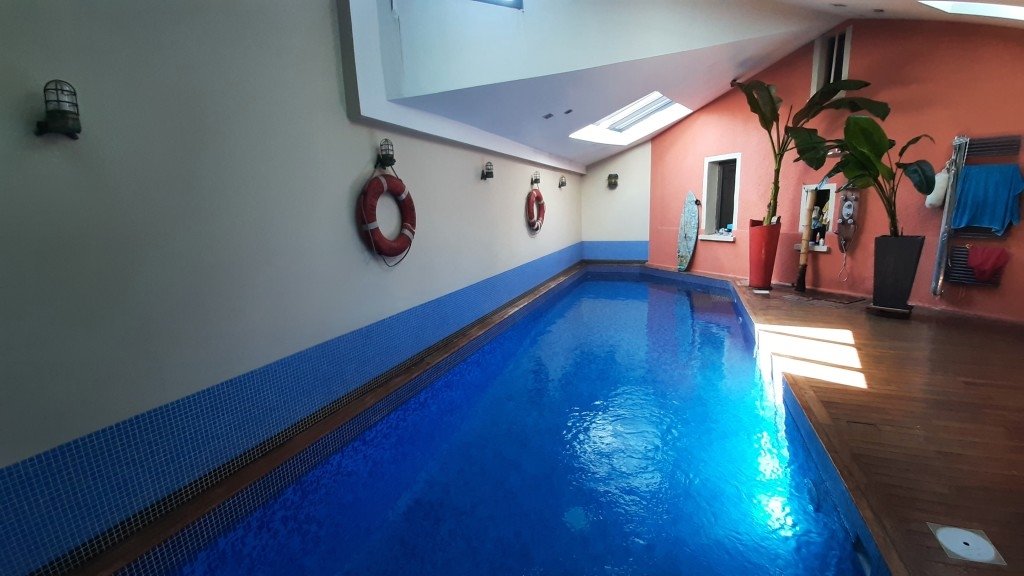 - Une pièce sous verrière de 60m2 avec une piscine intérieure de 11x3.5m et du parquet bateau