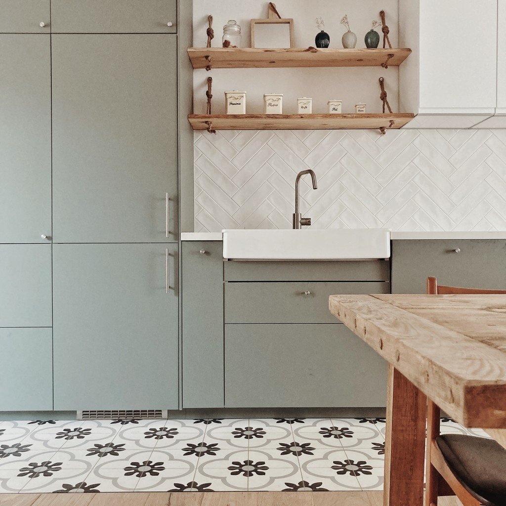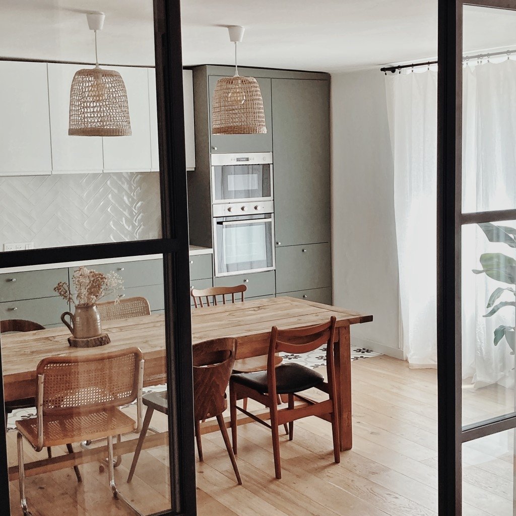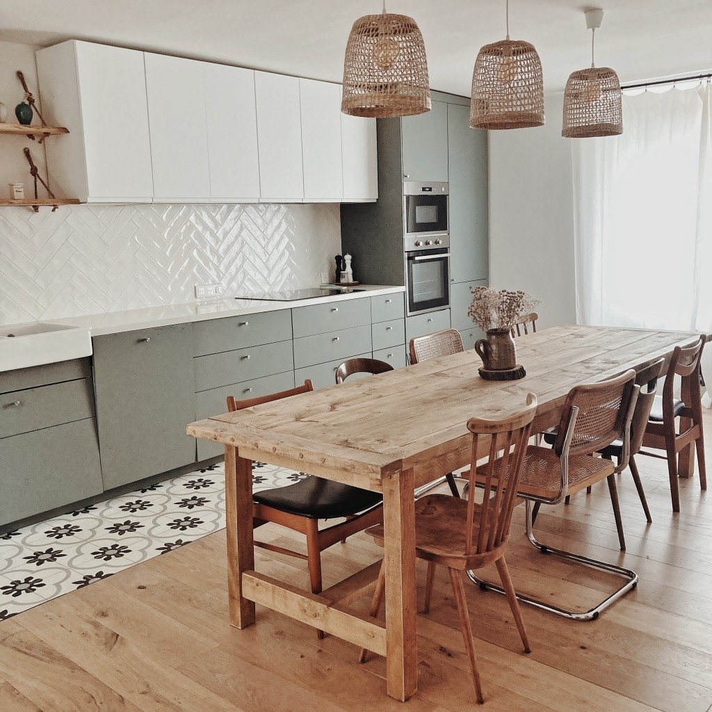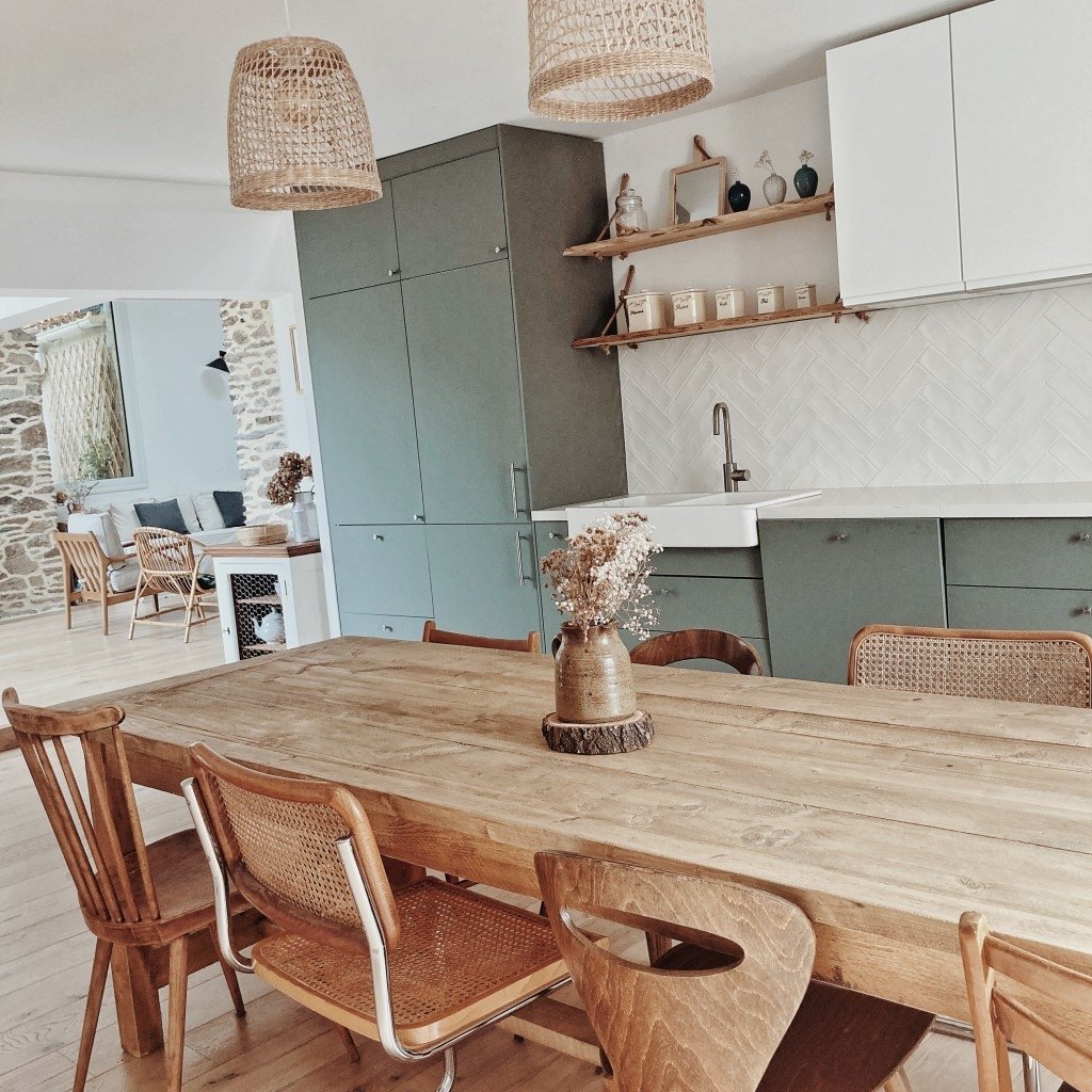 - d’une grande cuisine en longueur avec une grande table de ferme et des chaises design dépareillées, au sol (carreaux de ciment et parquet). Côté déco : miroir louis Philippe et buffet ancien chinés.