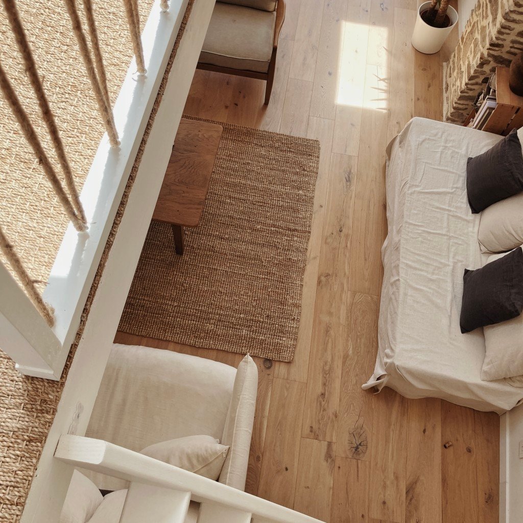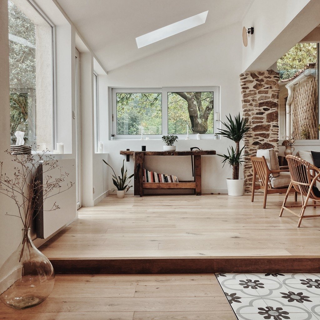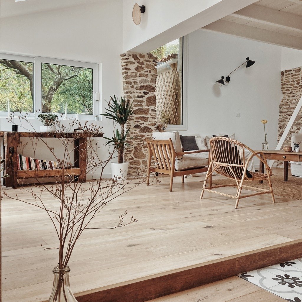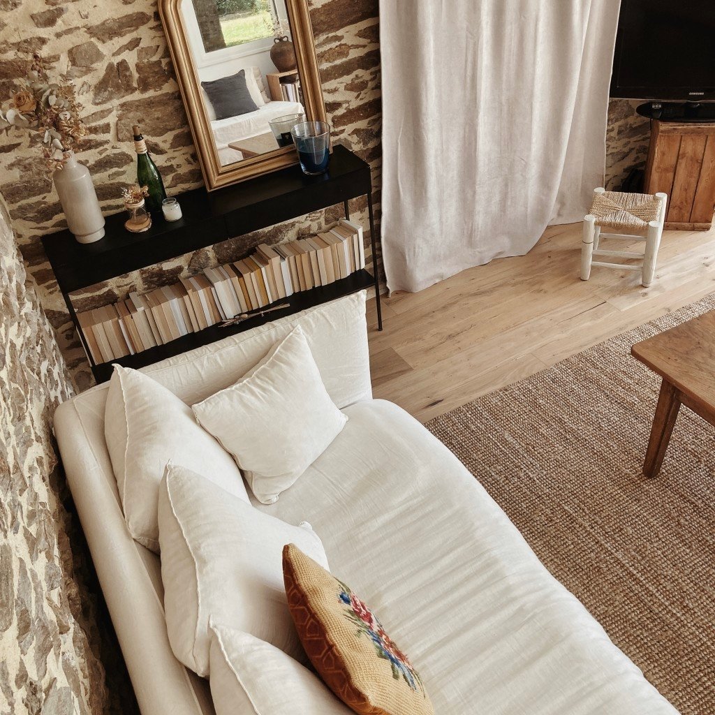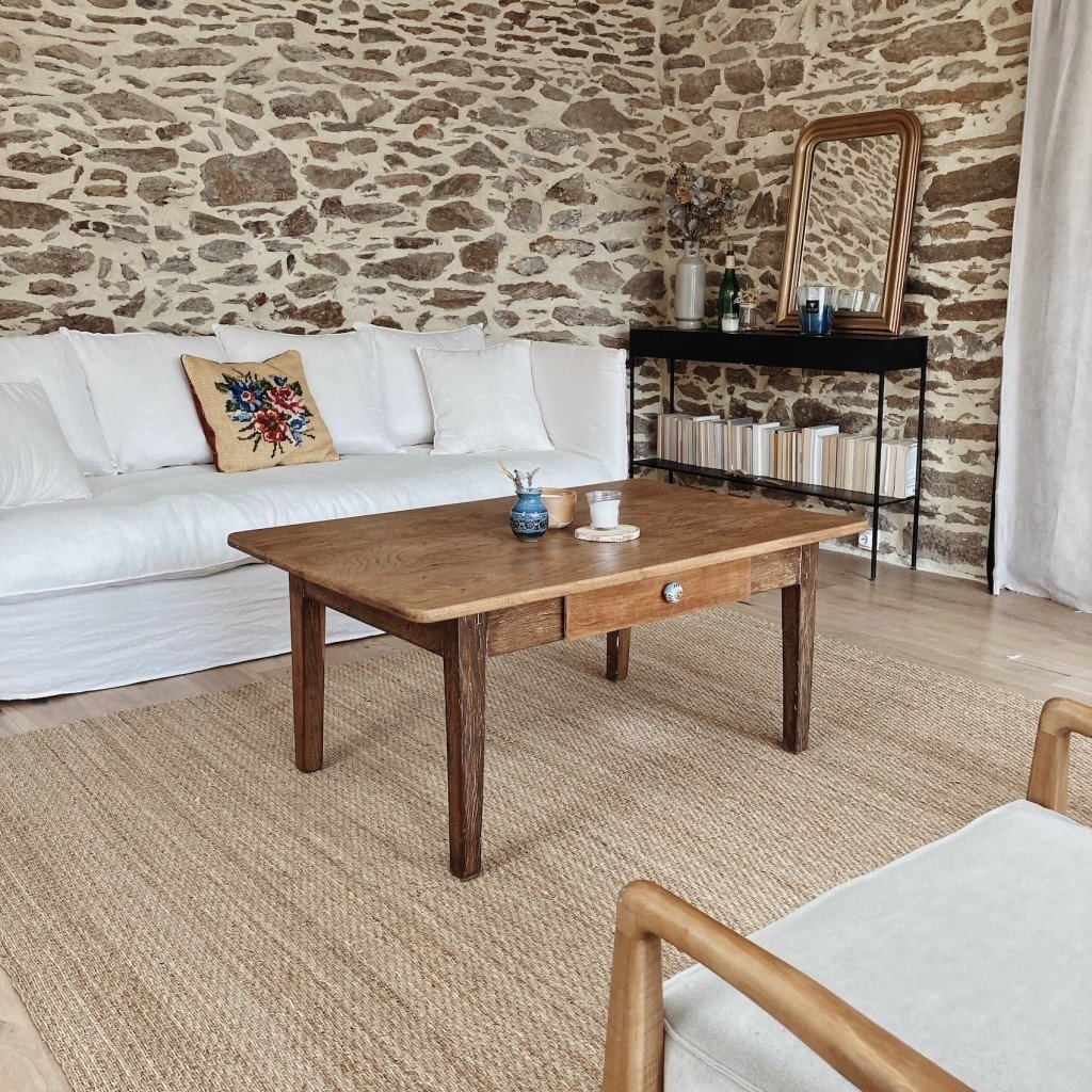 - d’un salon créé dans une ancienne véranda baignée de lumière, pierres apparentes, lambris blanc et matières naturelles (ancien établi, jonc de mer, table de ferme, canapé blanc en lin...)