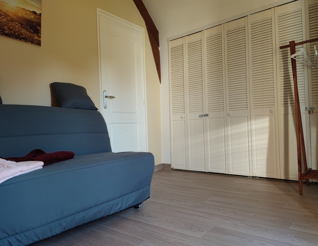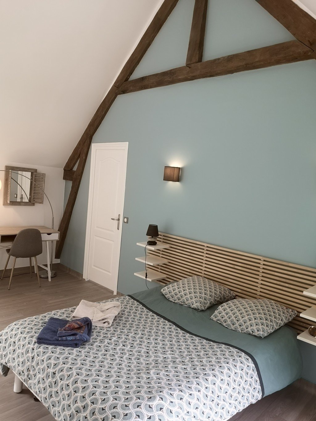 - grande chambre ouverte, comprenant un lit, commode, un bureau, et une fenêtre. Poutres apparentes, sol pvc imitation parquet.