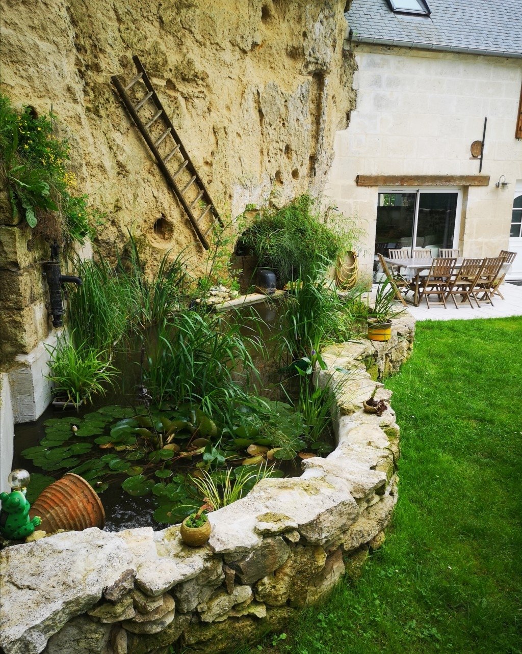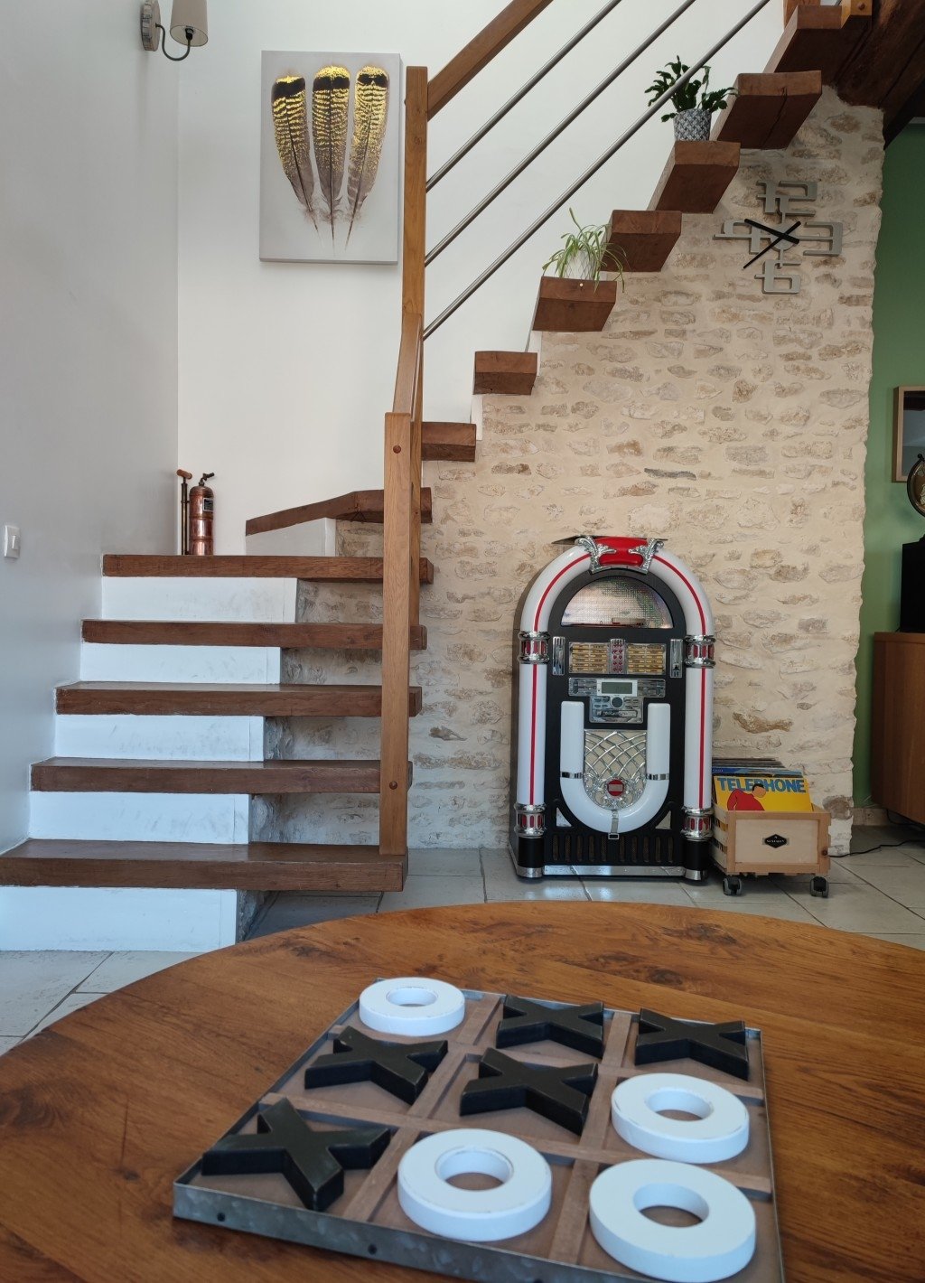 - un poêle à granulés, poutres apparentes au plafond, un mur en pierre portant l'escalier en bois.