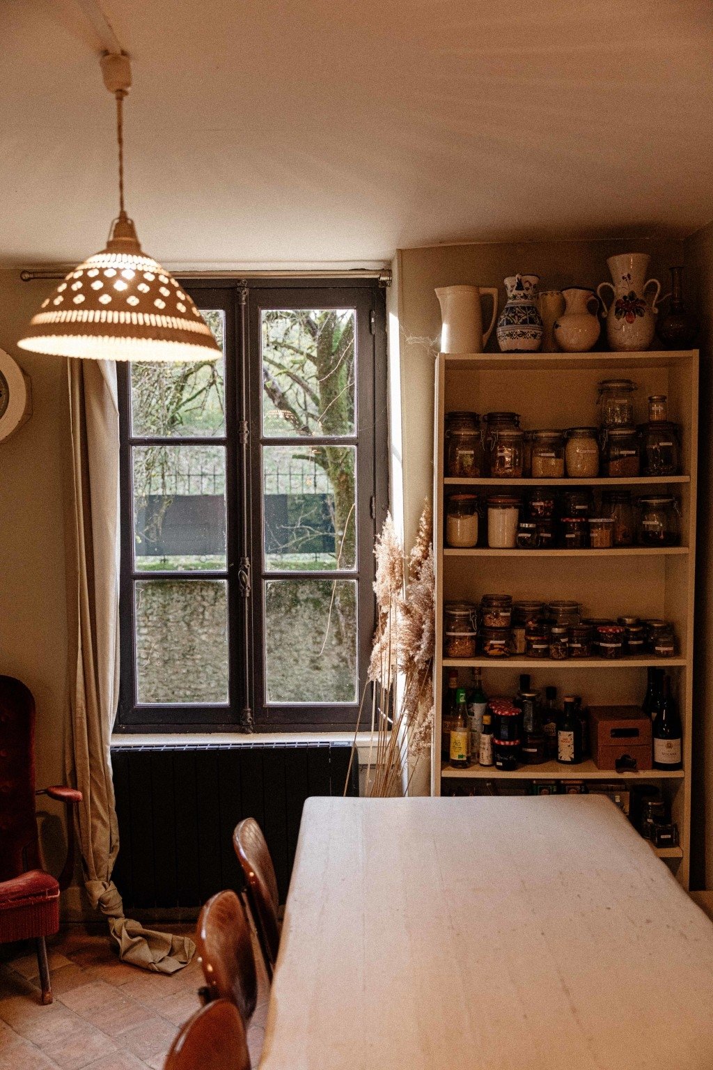 - une cuisine avec des tomettes donnant sur une terrasse avec vue rivière et forêt
