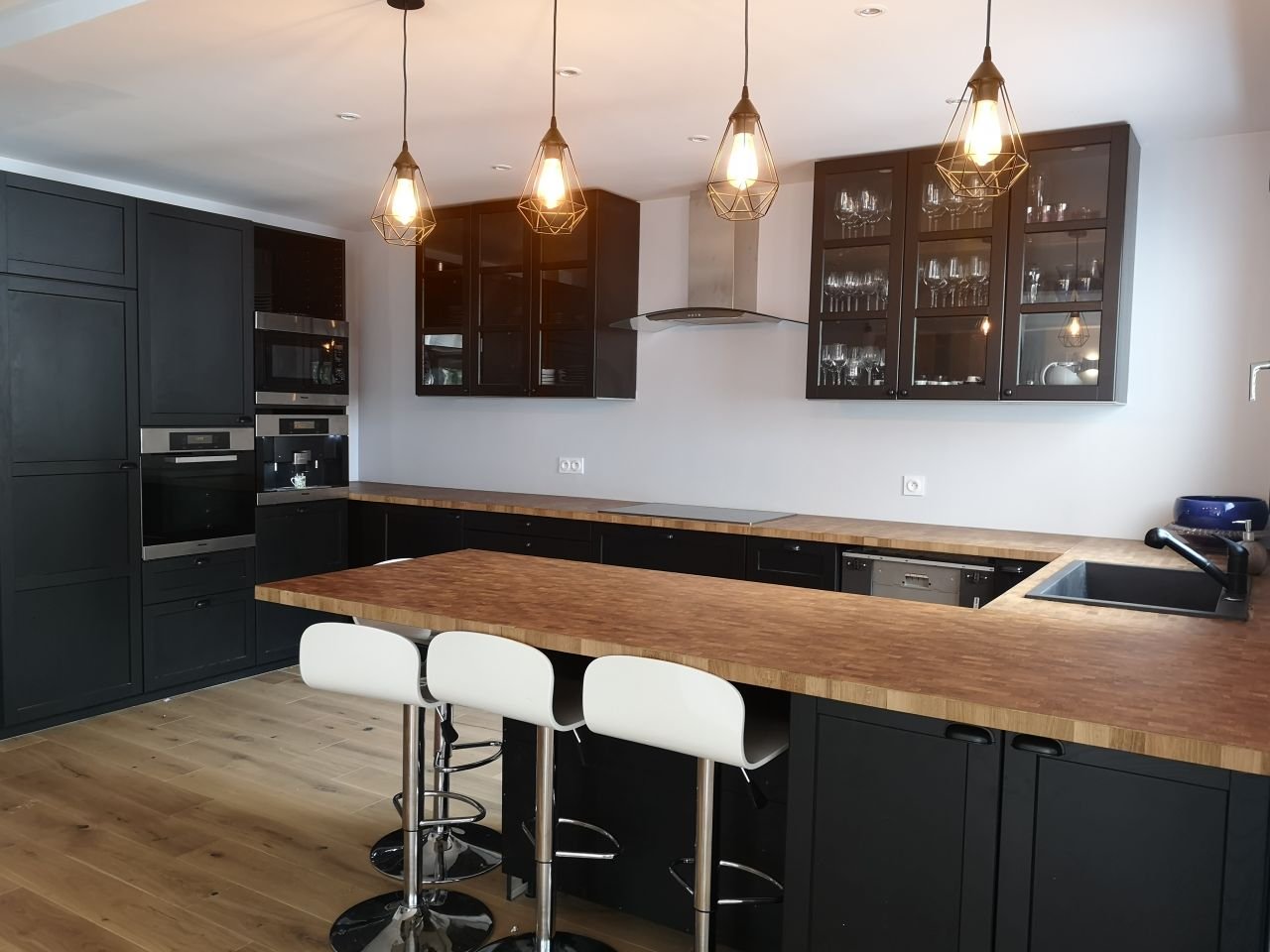 - belle pièce de vie de 80 m² ouverte sur cuisine US noire et moderne