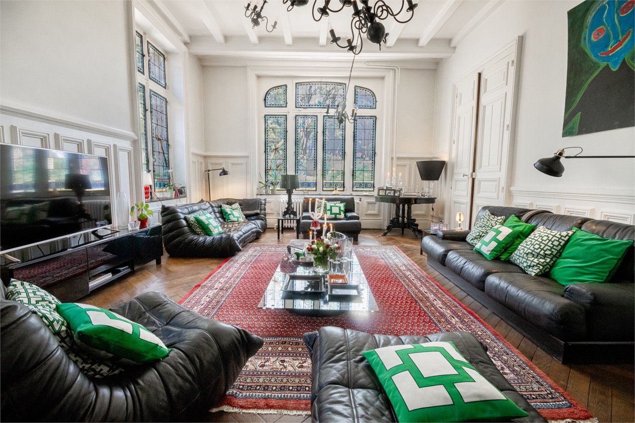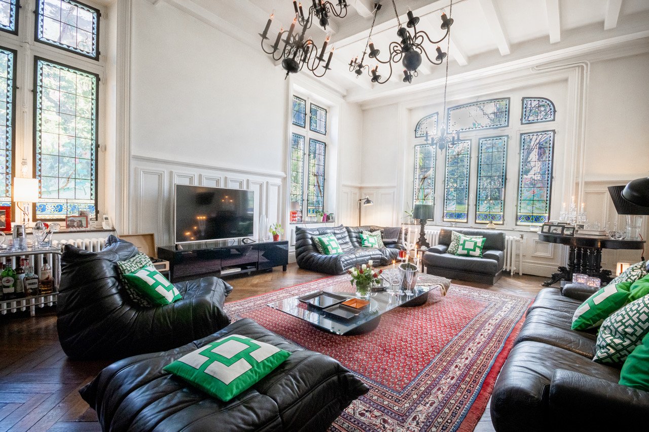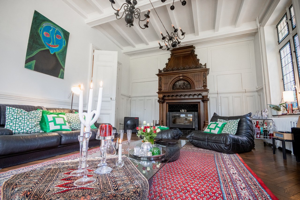 - 1 grand salon avec une cheminée en bois sculpté et des vitraux représentant un jardin fleuri