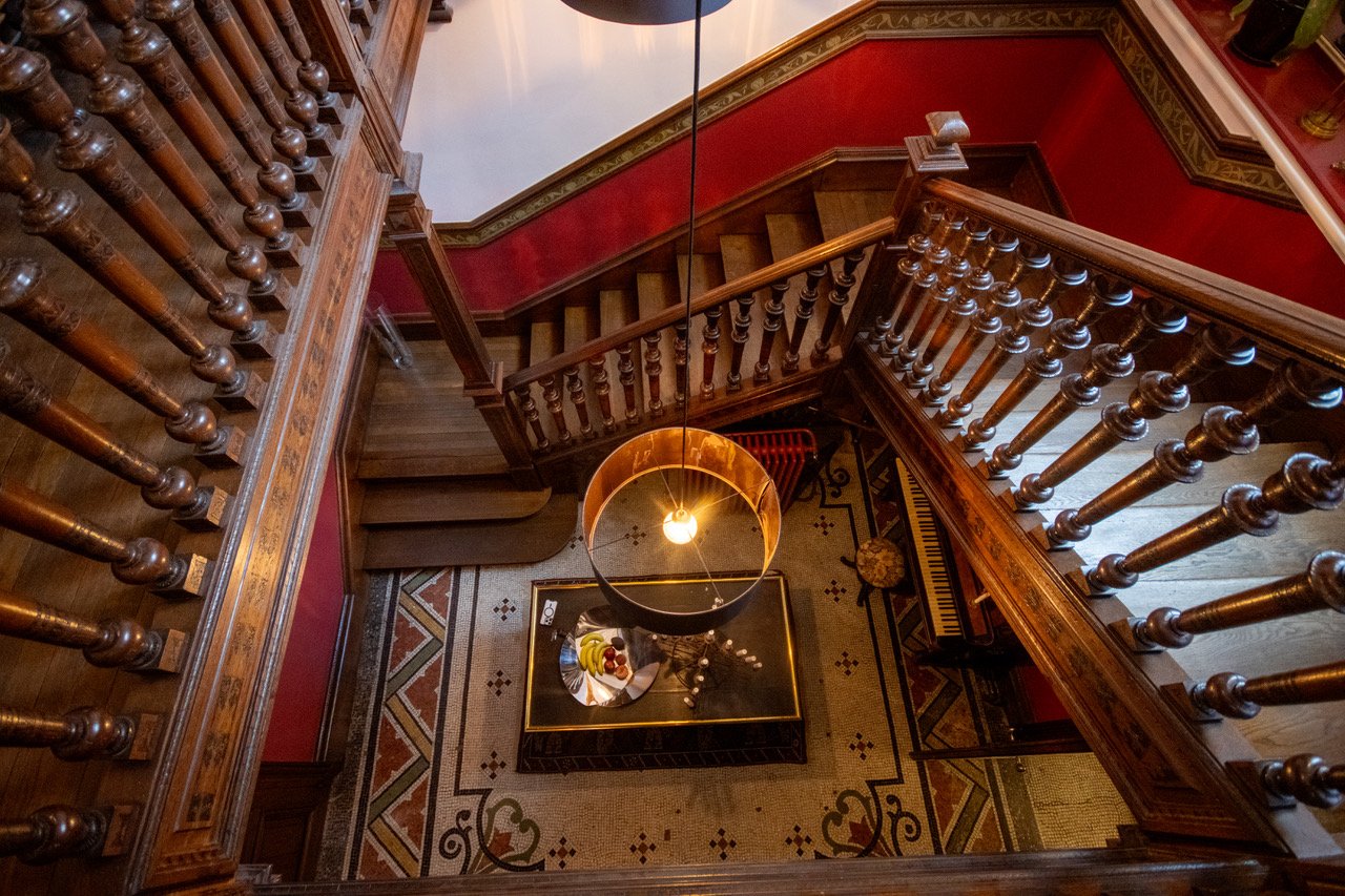- 1 majestueuse cage d'escalier en bois entièrement pyrogravée avec un grand vitrail multicolore