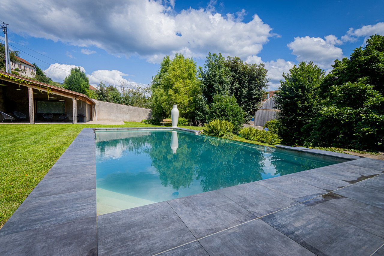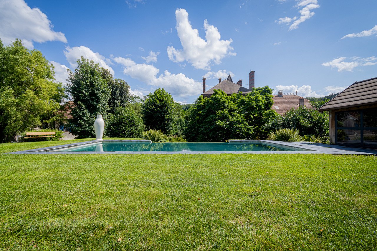 Un parc arboré avec piscine, arbres anciens et plusieurs terrasses entoure la maison.