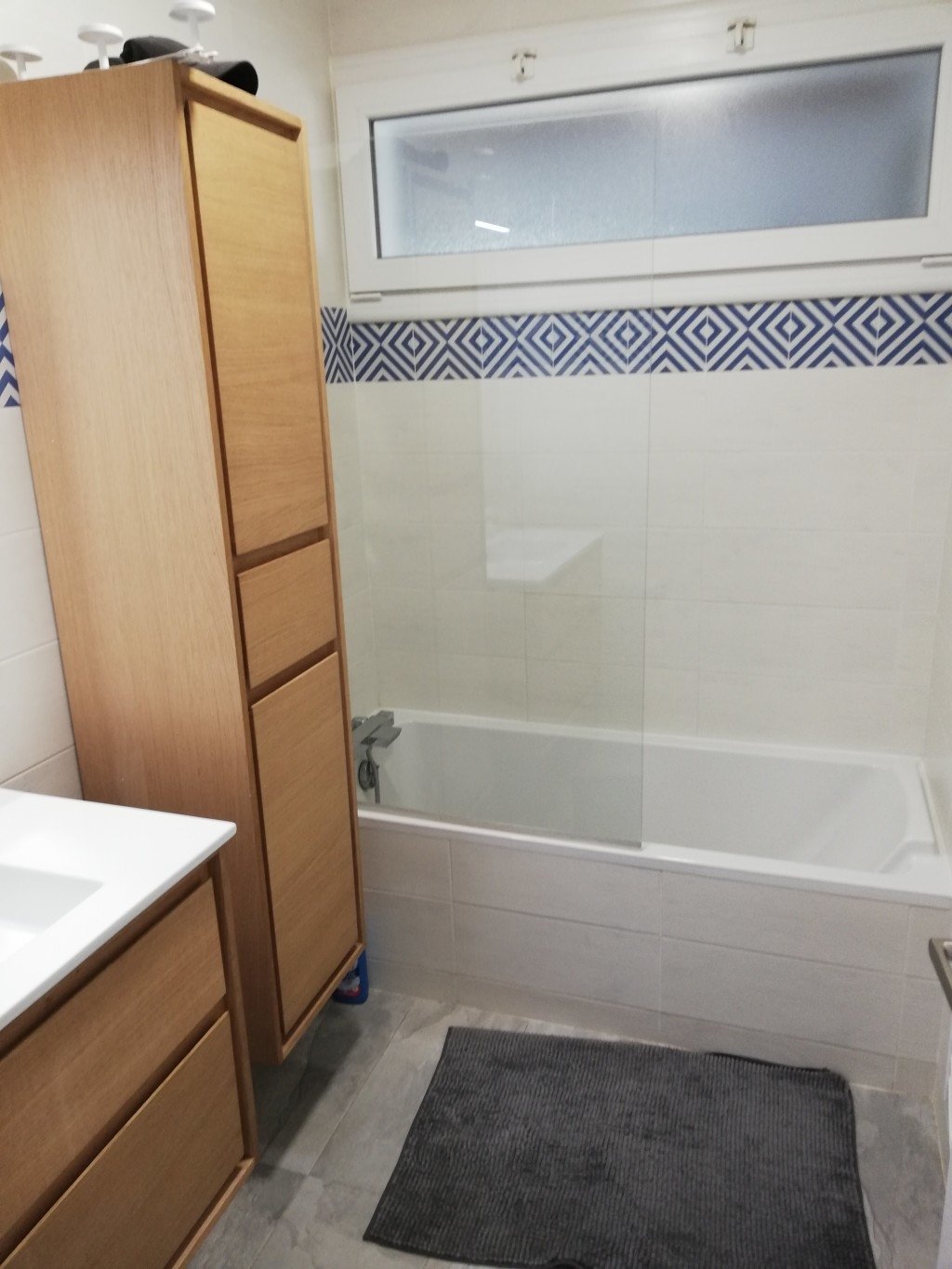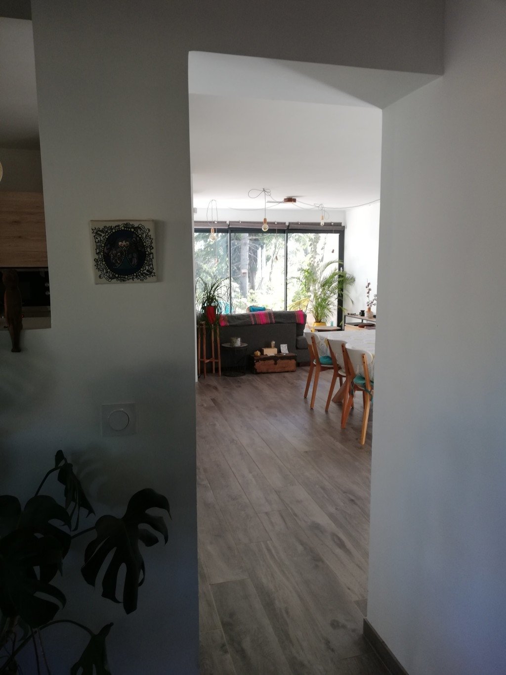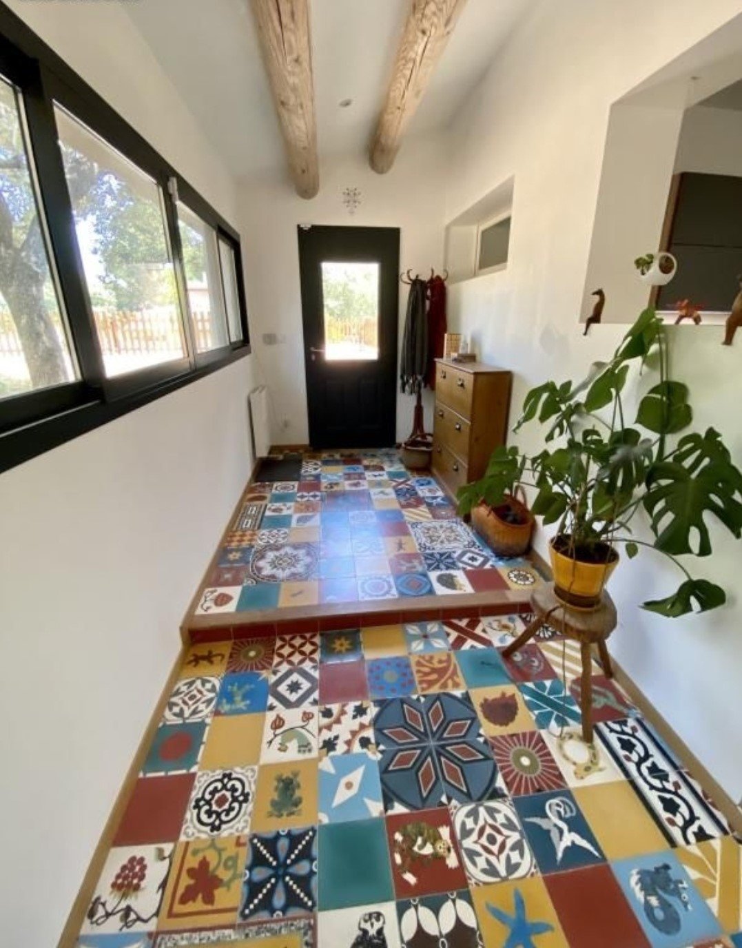 - Entrée avec poutres apparentes, carreaux de ciment et grande baie vitrée