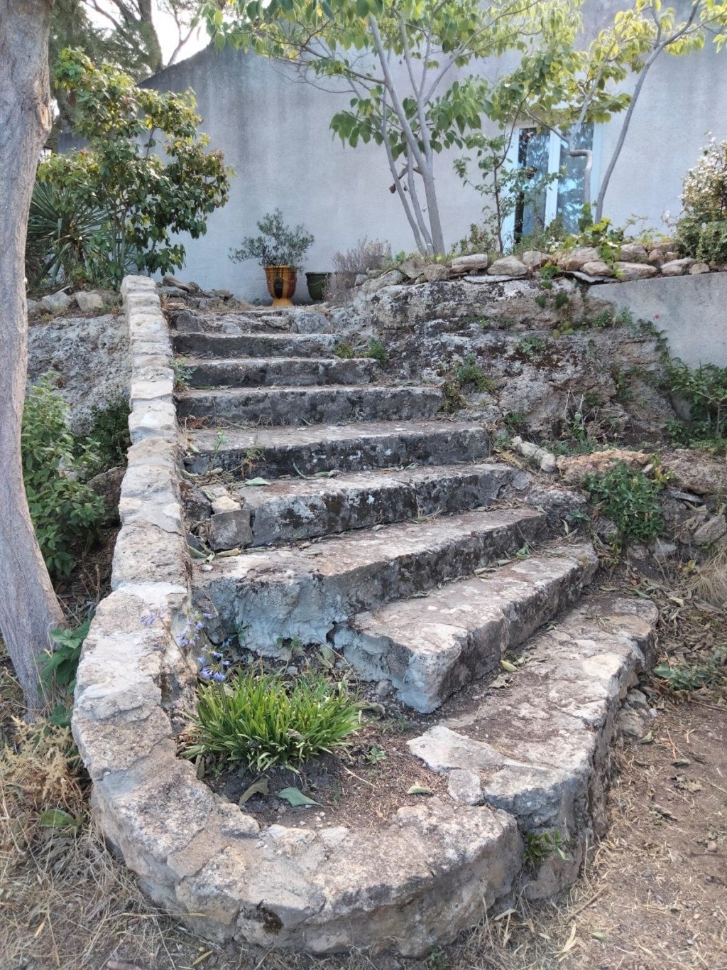 - Grand escalier en pierre sèche avec bassin