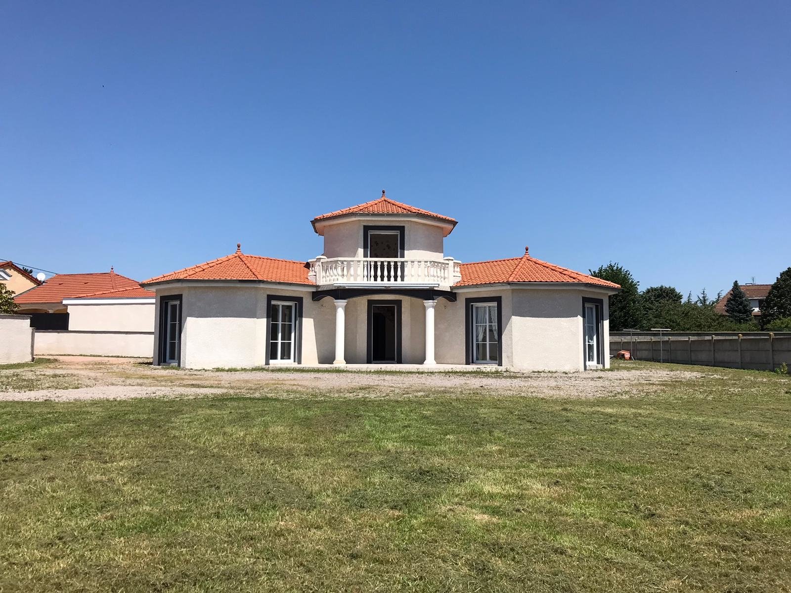 Maison de style gréco-romain avec une tour centrale octogonale à un étage ornée d’un magnifique balcon à balustres.