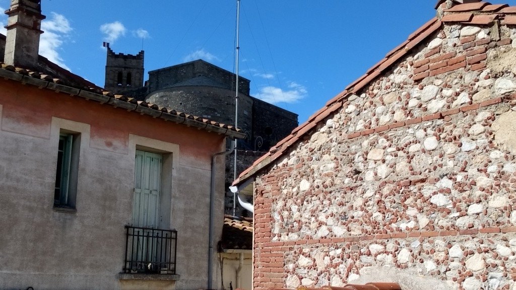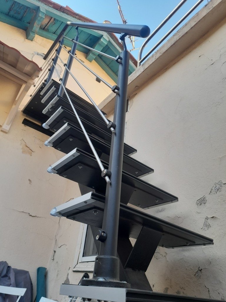 Escalier extérieur sur petite terrasse menant à un solarium : toits et vue sur toits, terrasses, cloître.