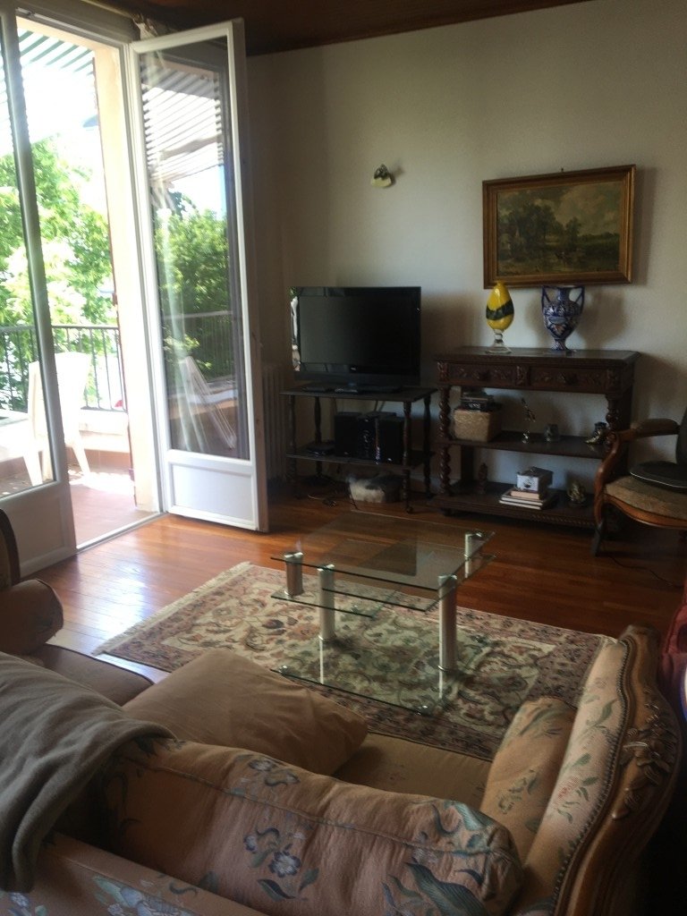 - salon salle à manger avec parquet ancien, meubles style Henri II et plafond en lambris vernis chêne foncé donnant sur une terrasse au-dessus du jardin arboré