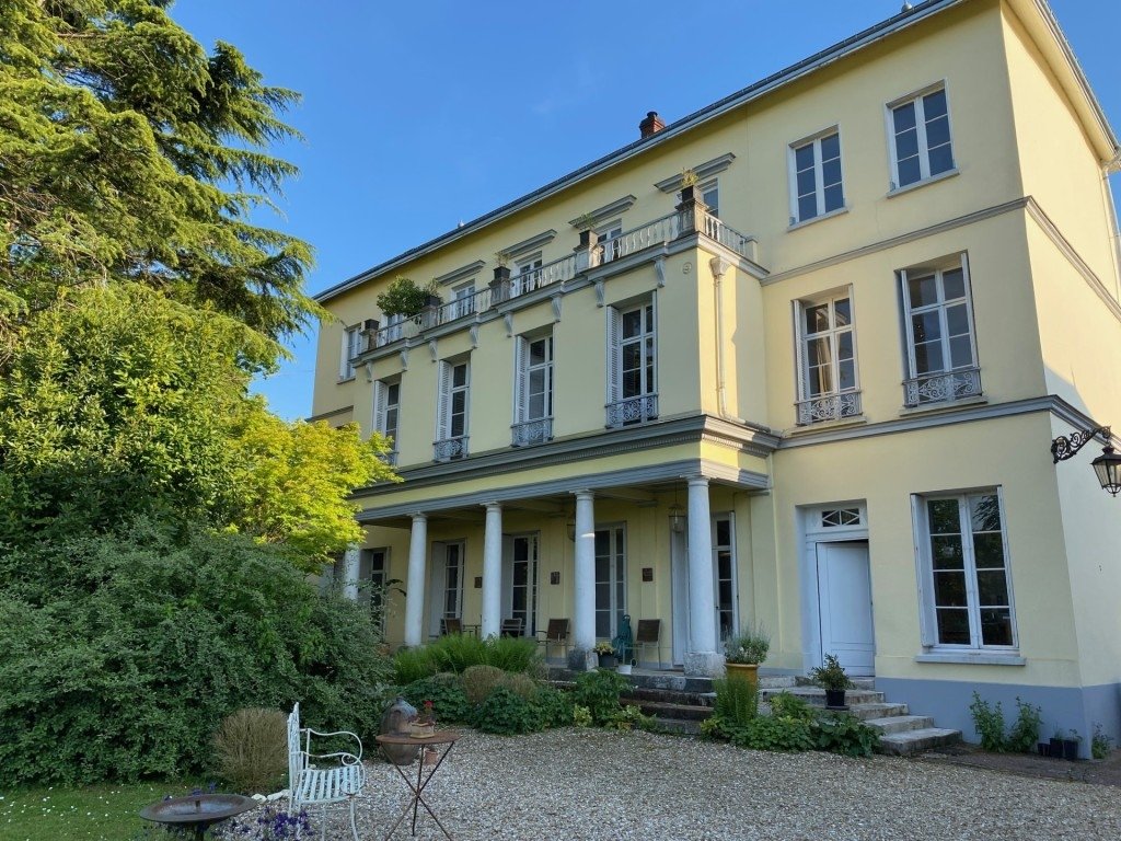 Unique exemple dans la région de maison Directoire (environ 1795) avec grand perron à colonnade (5 colonnes). Façade jaune et grise.