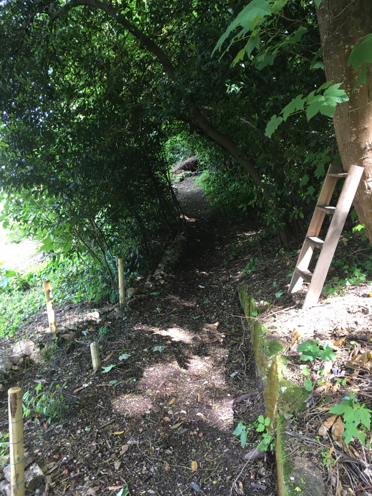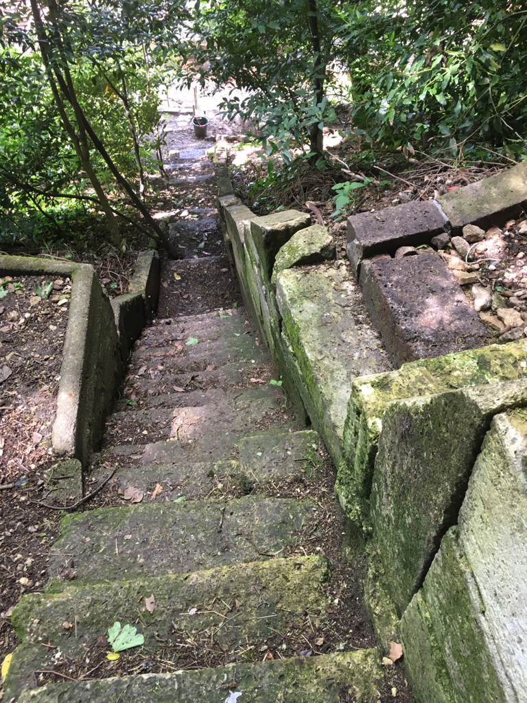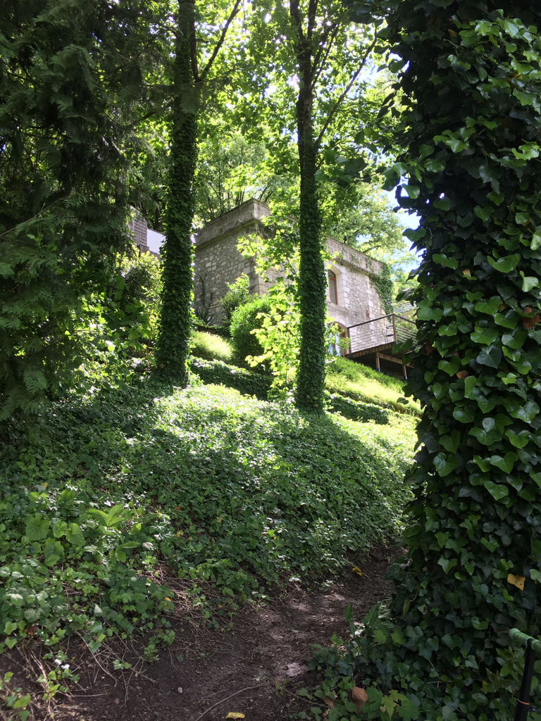 Terrain traversé par des chemins de ronde cachant bassins, tour, et escaliers d'époque XVe siècle
