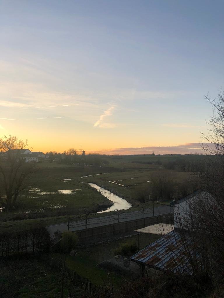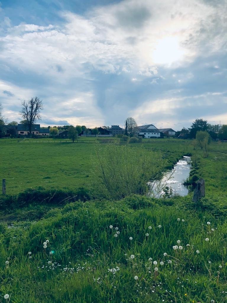 - vue sur champ et ruisseau derrière la route