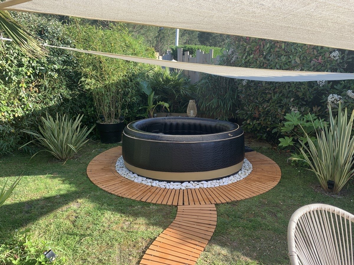 jardin paysagé avec terrasse bois et piscine.