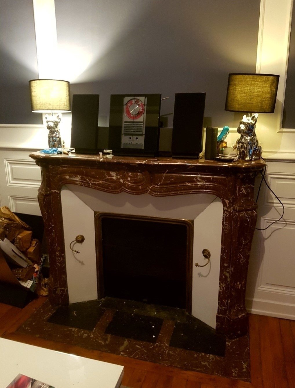 - salon avec parquet, moulures, rosace et cheminée en marbre