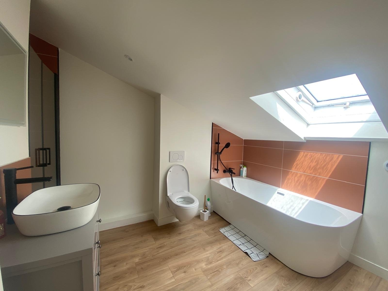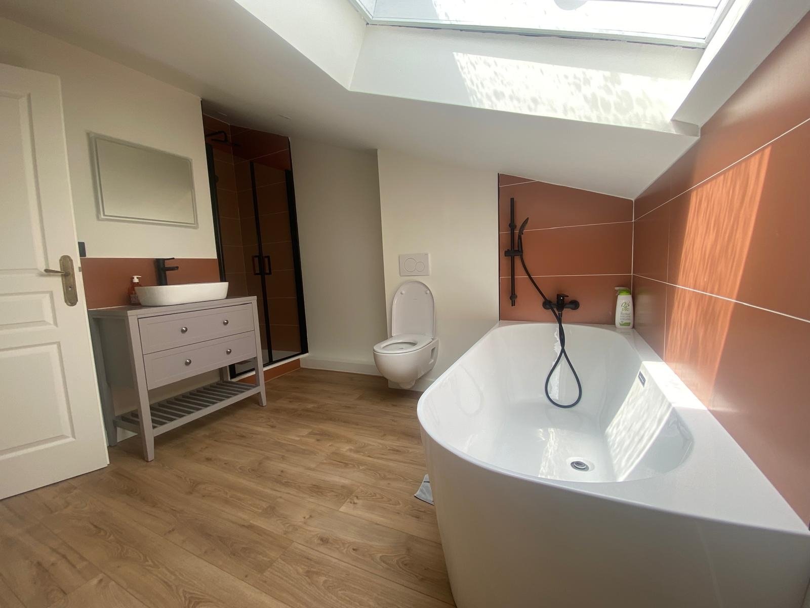 Au deuxième étagé sous combles : une salle de bain, une pièce tv salon et une chambre qui donne sur une tropézienne avec vue sur les toits.