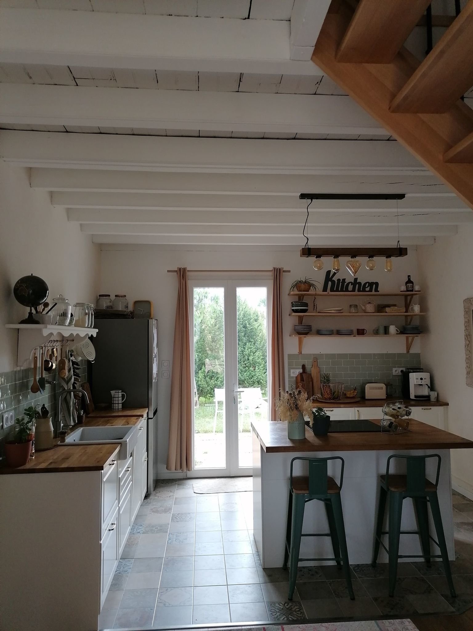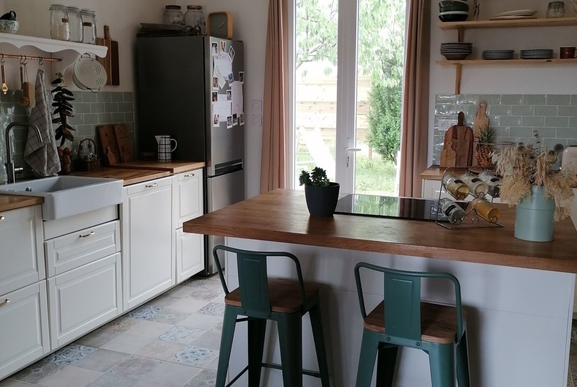 - une pièce de vie traversante de 48 m² (poutres apparentes) avec salon, salle à manger et cuisine ouverte, donnant sur le jardin et une terrasse (exposée sud)
