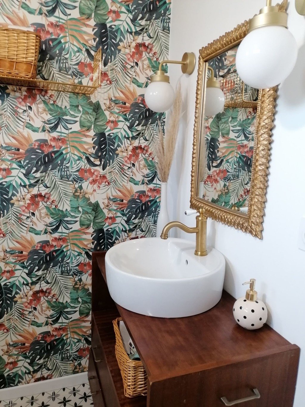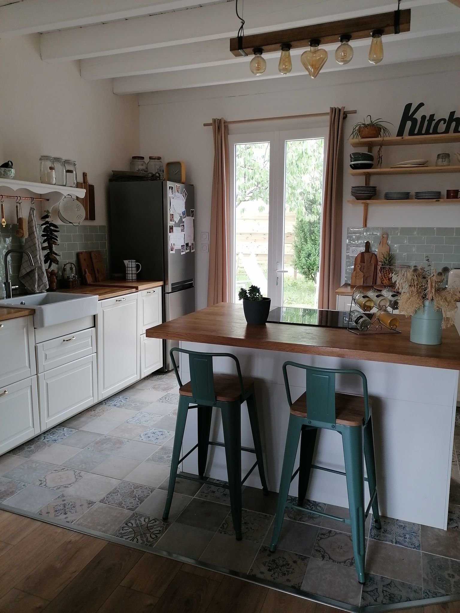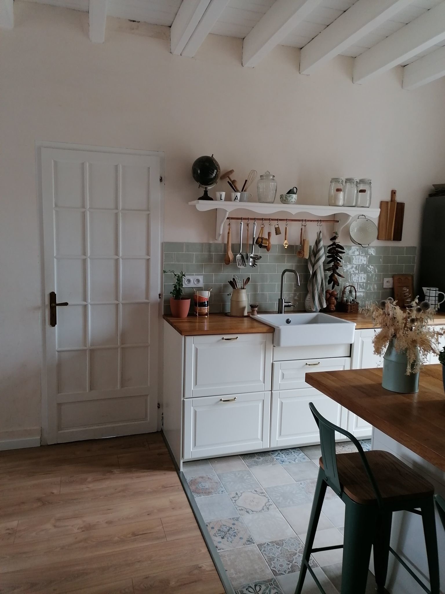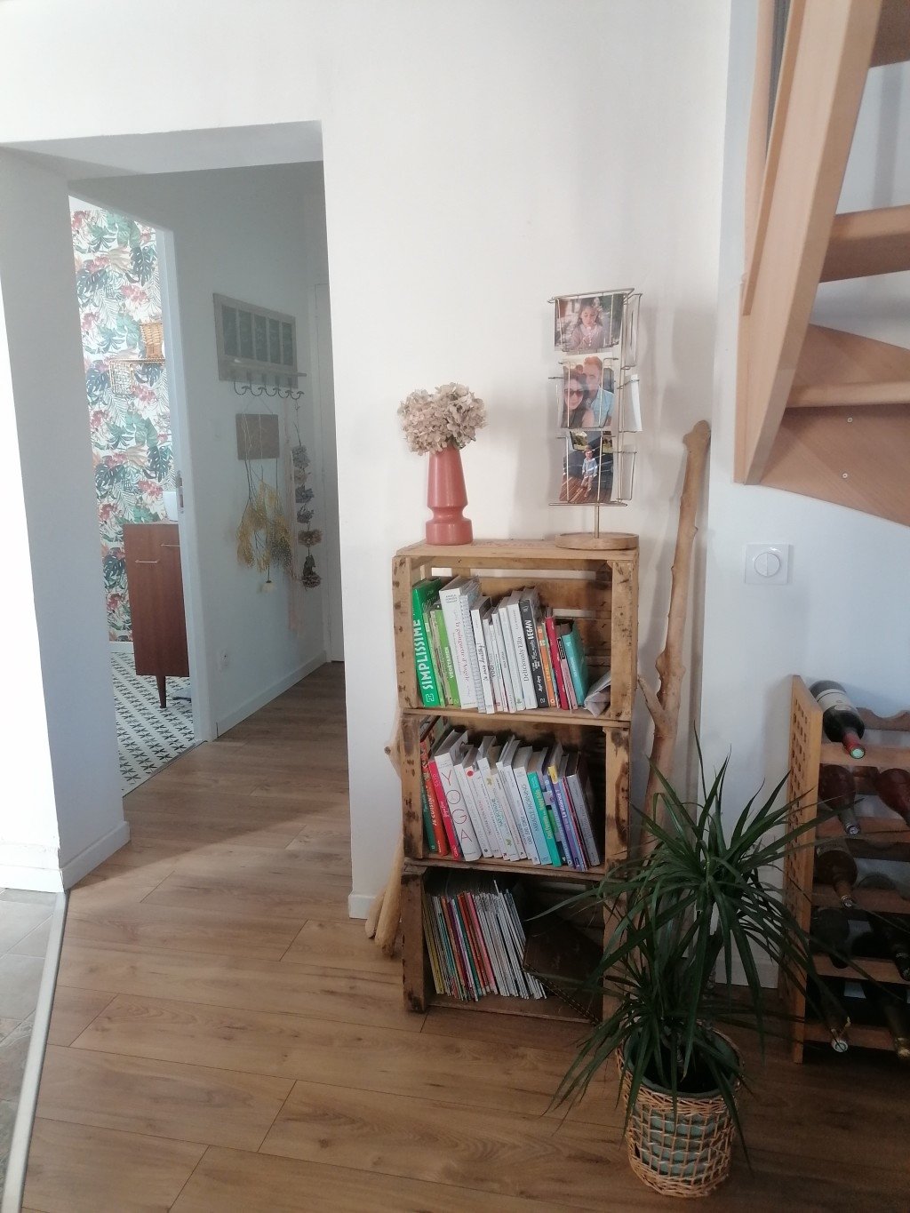 - une entrée sur la pièce de vie (avec des carreaux façon carreaux de ciment et un parquet flottant chêne)