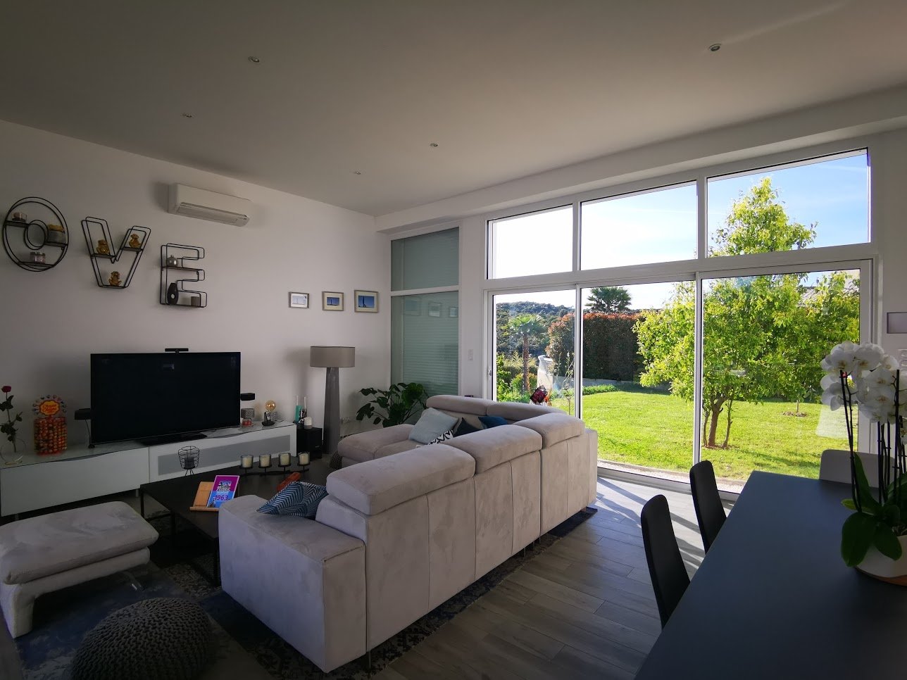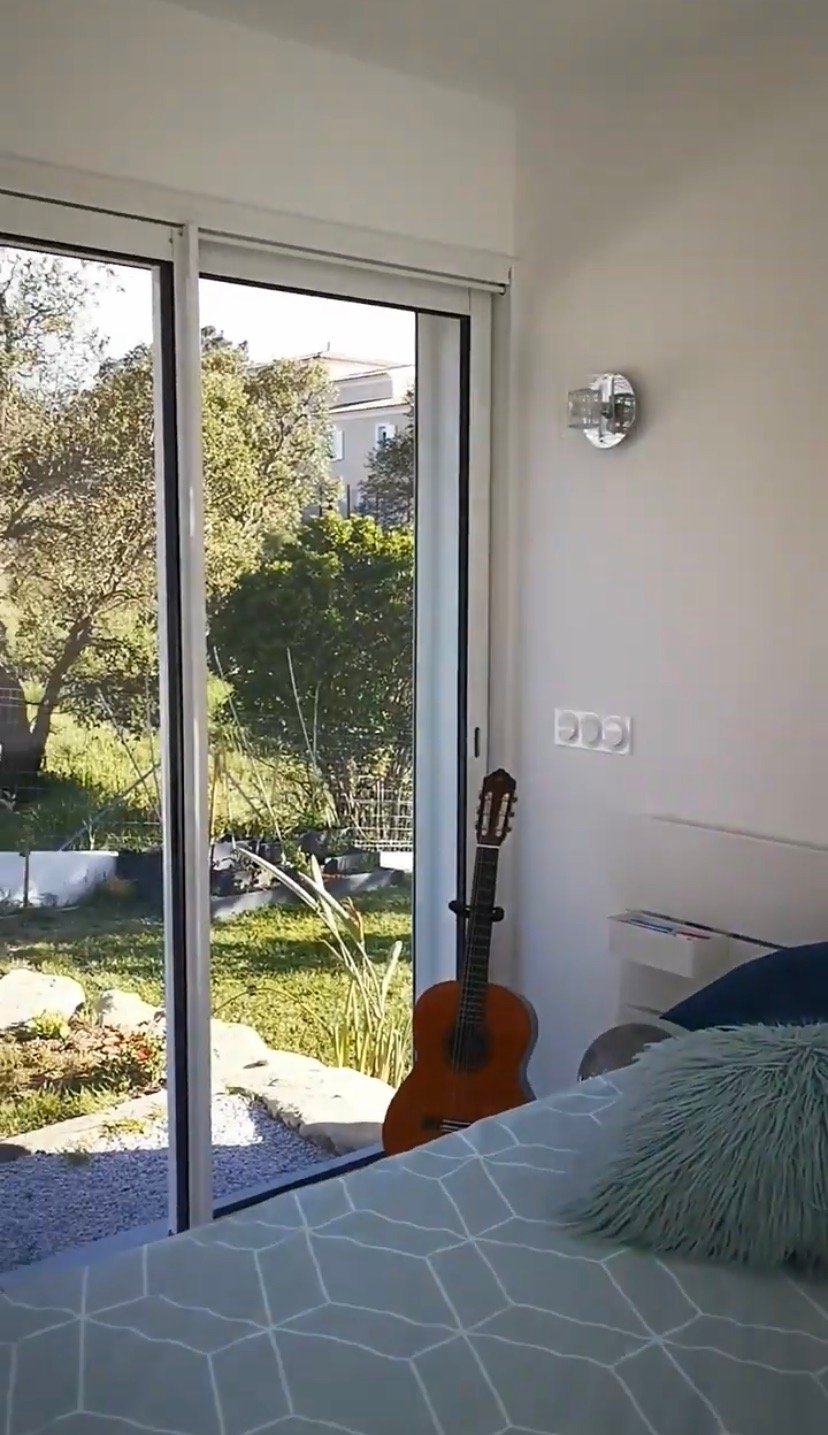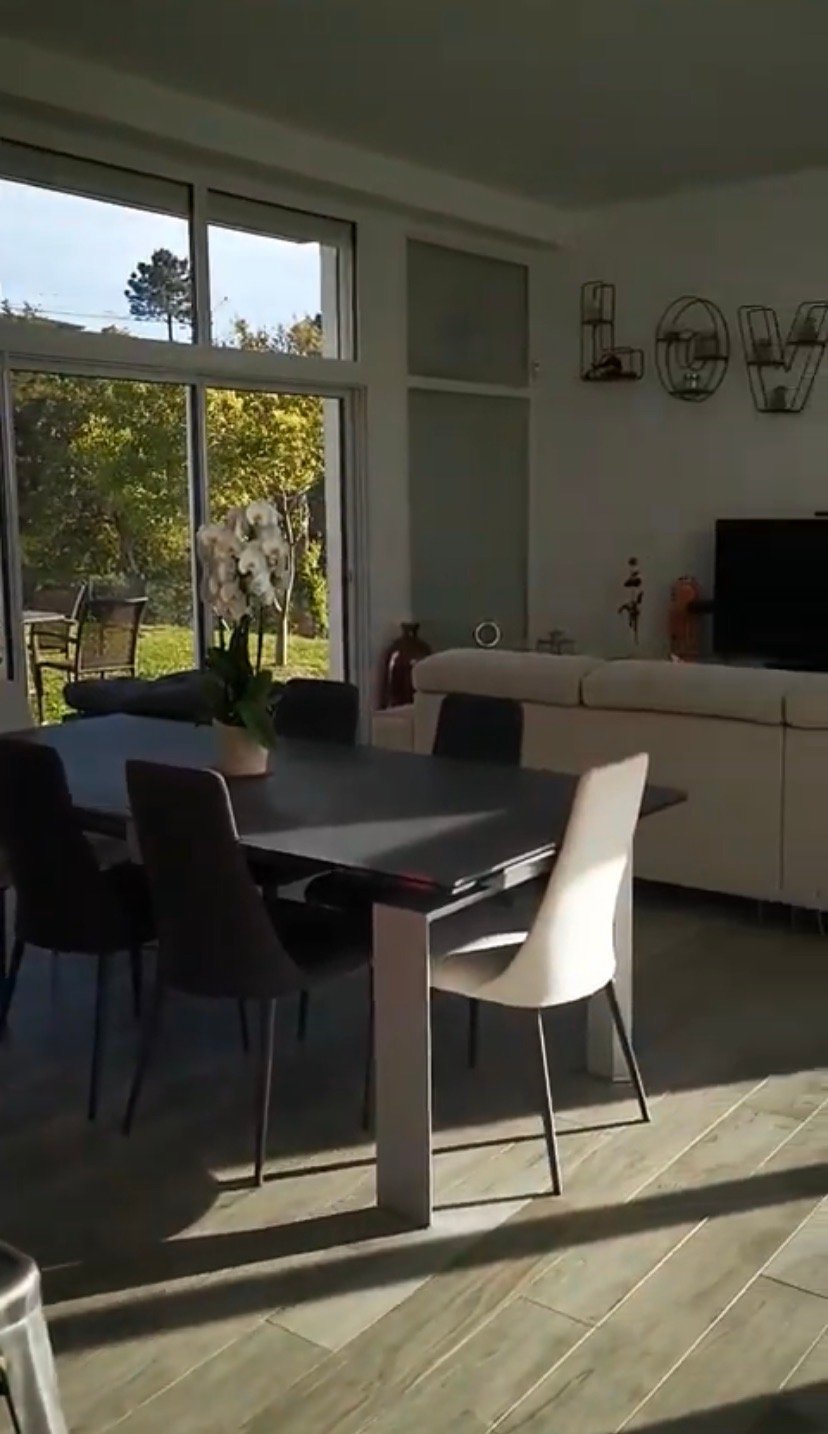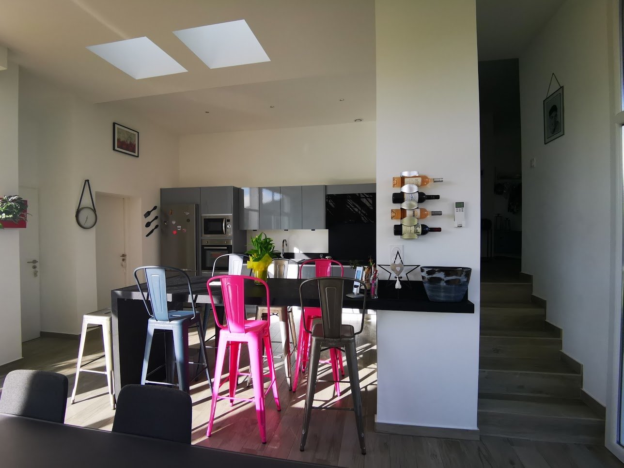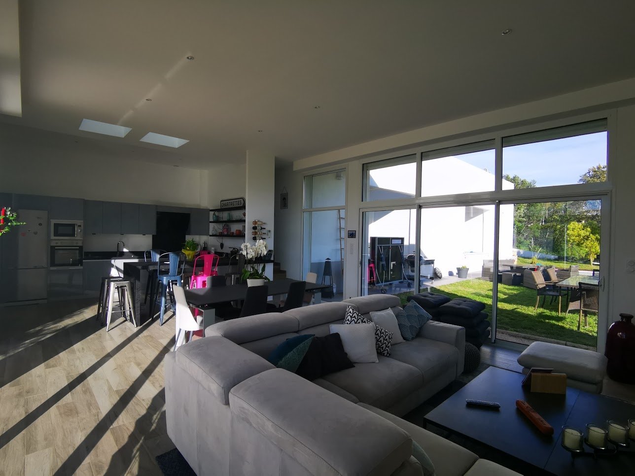 - un salon avec cuisine ouverte (spacieux, lumineux avec de grandes baies vitrées donnant sur l'extérieur)