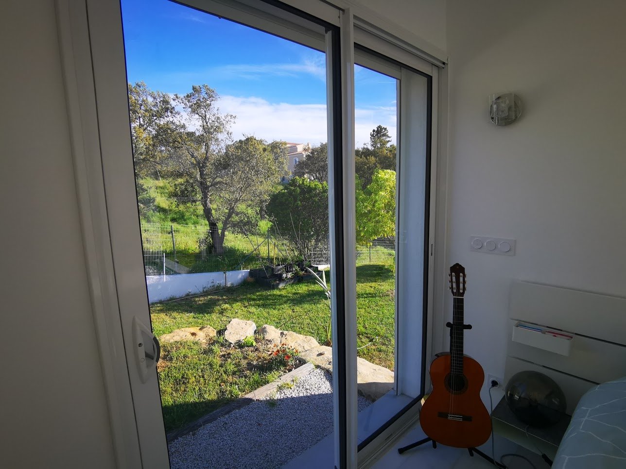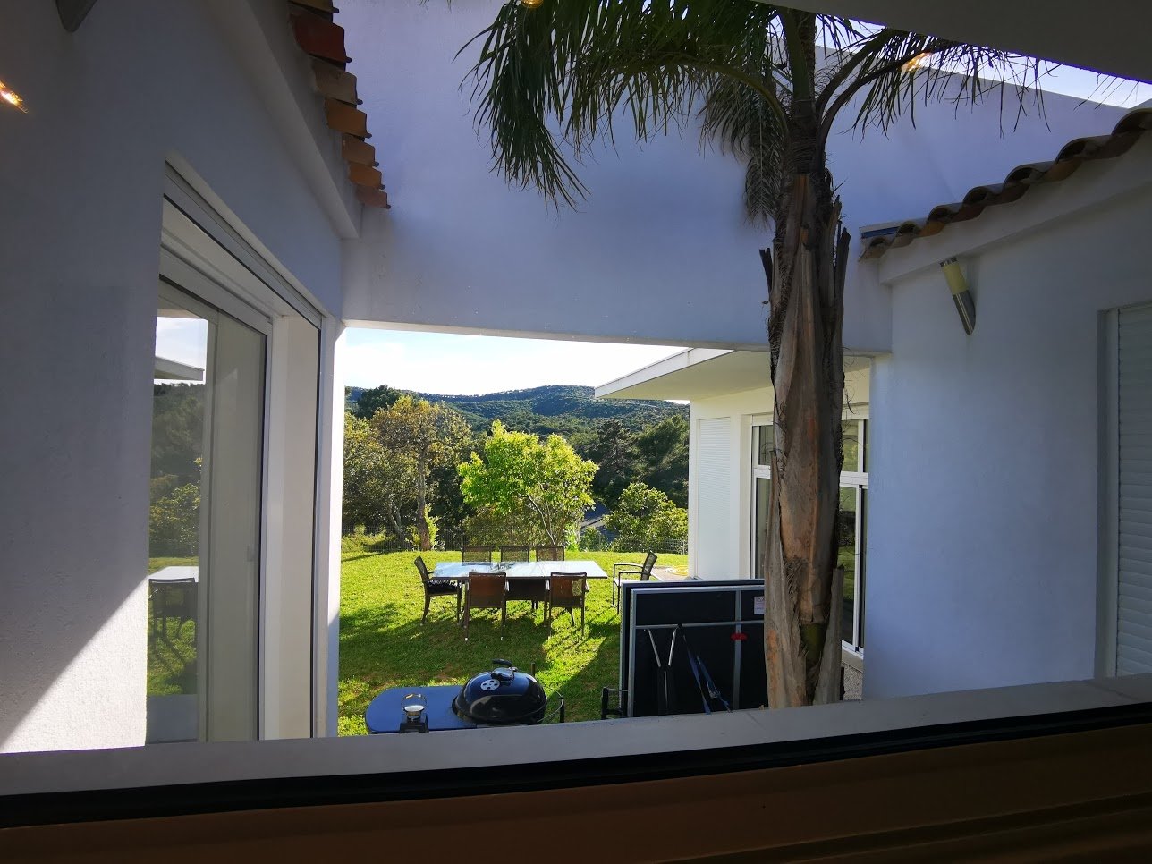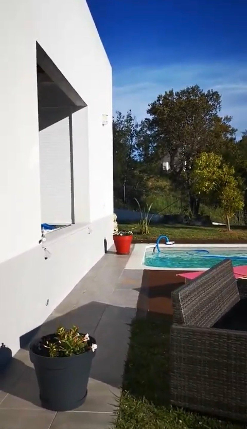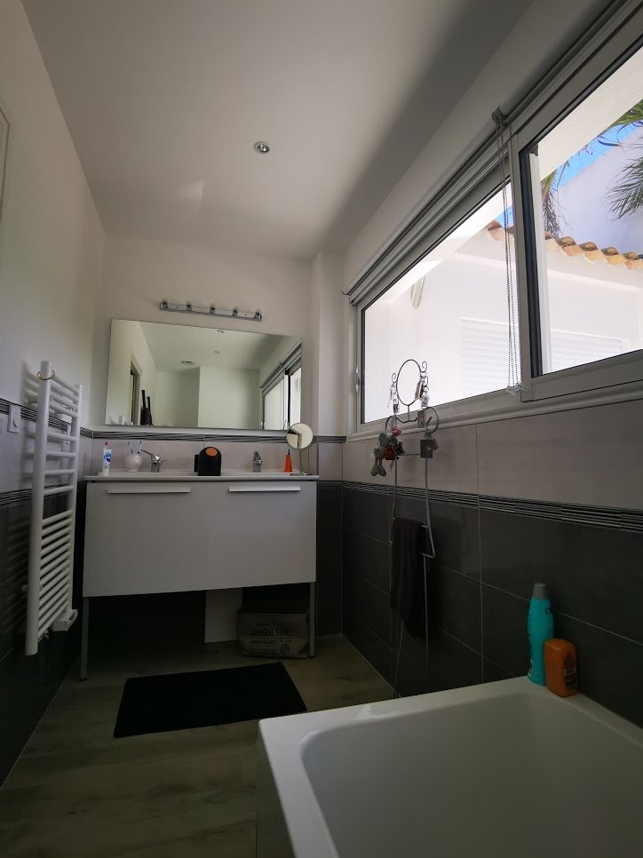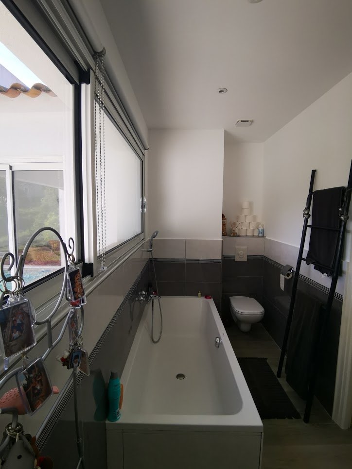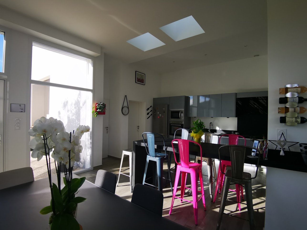 - un salon avec cuisine ouverte (spacieux, lumineux avec de grandes baies vitrées donnant sur l'extérieur)