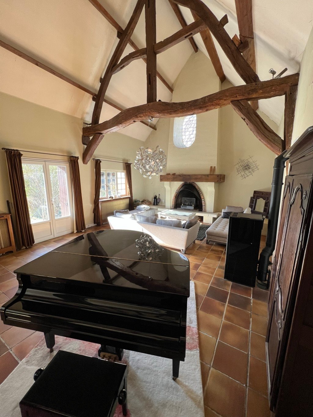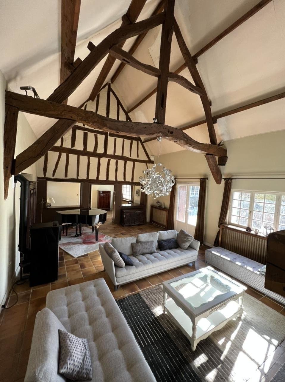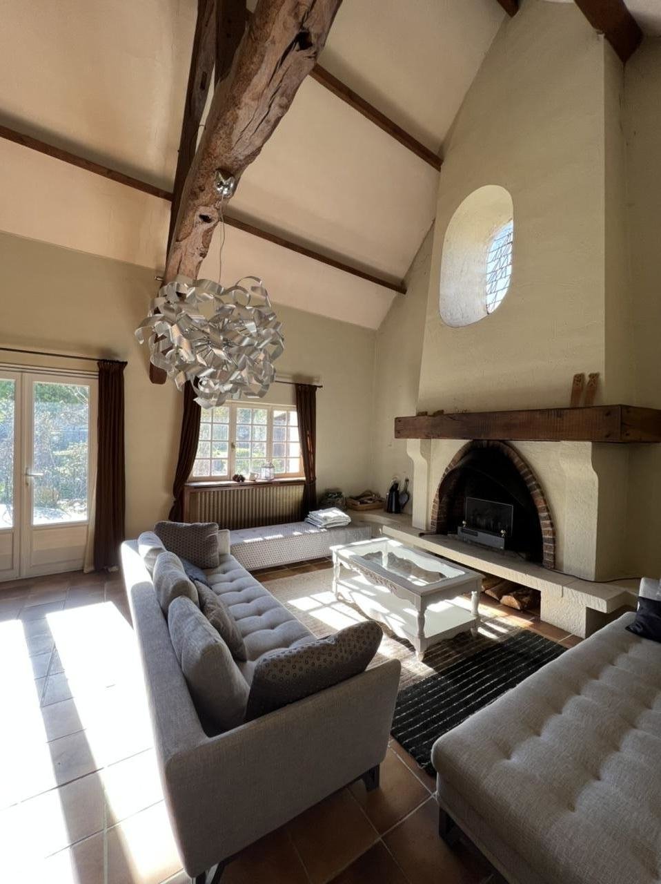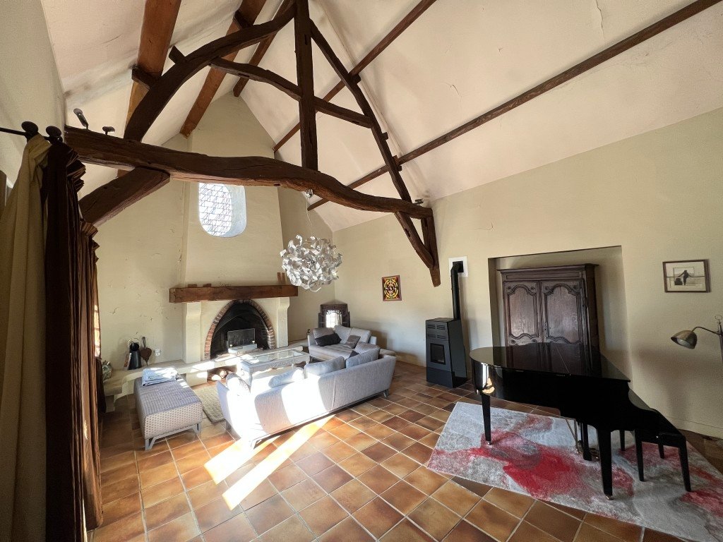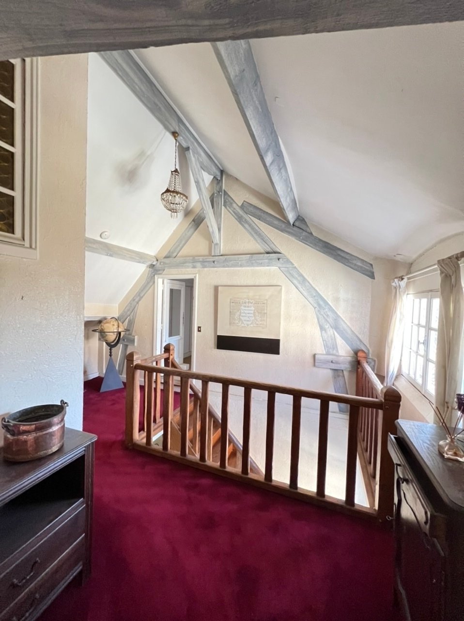Intérieur : belle entrée, salon avec belle hauteur sous plafond et cheminée, cuisine fermée, salles d'eau, chambres, grande mezzanine