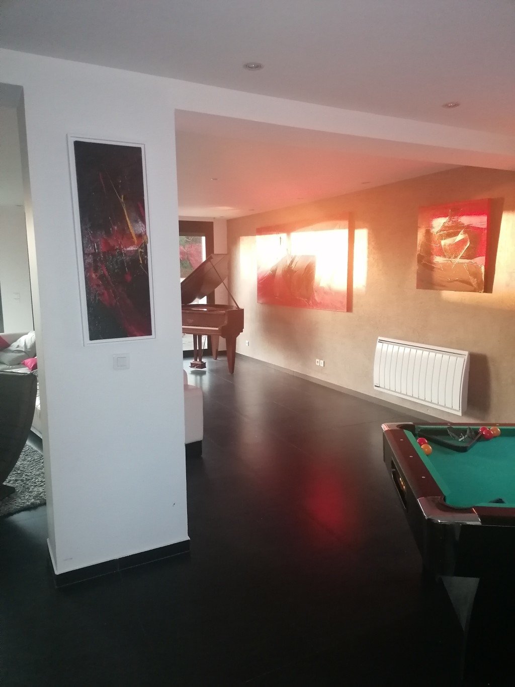 - une pièce de vie de 60m2, composée d' une table et d' une grande table basse. L'accès à l'extérieur par nos baies vitrées donne un vrai charme à la pièce. Piano et billard