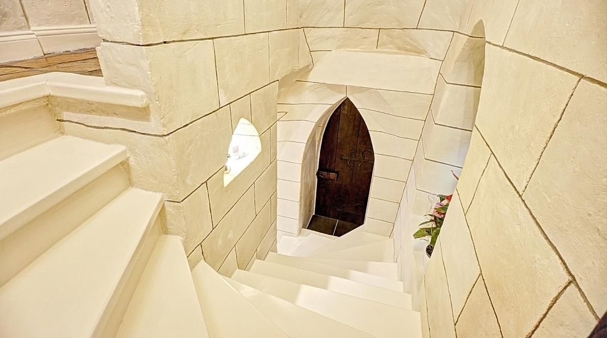 - Au-dessus : une grande pièce avec deux tourelles.