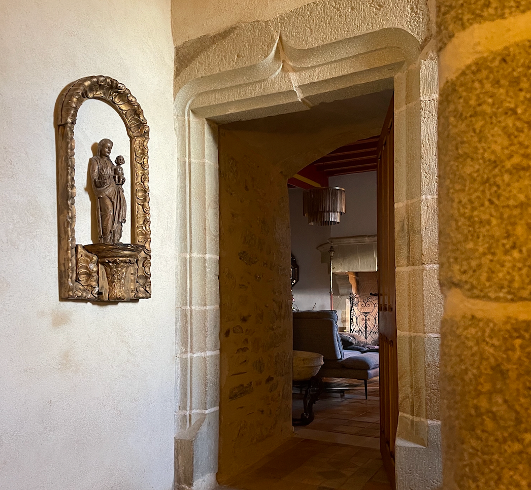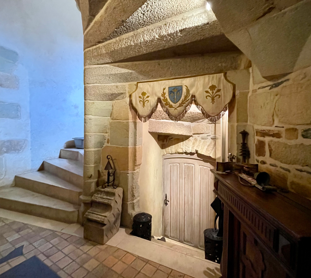 - Entrée médiévale avec son bénitier et gigantesque escalier en pierre desservant la totalité du manoir