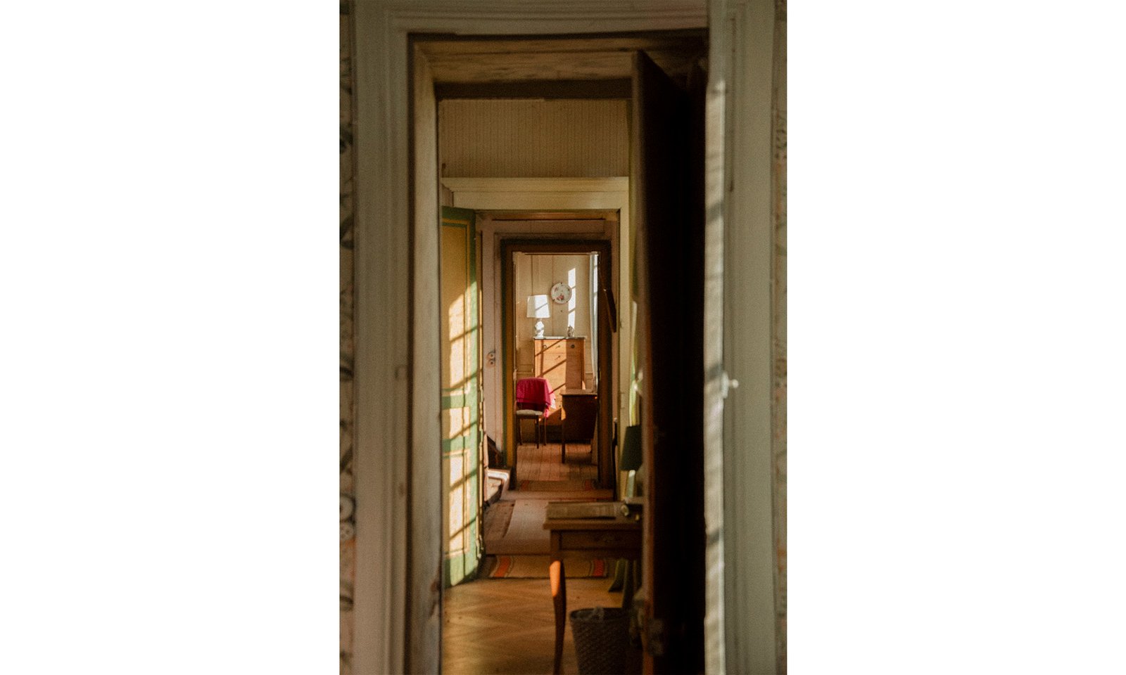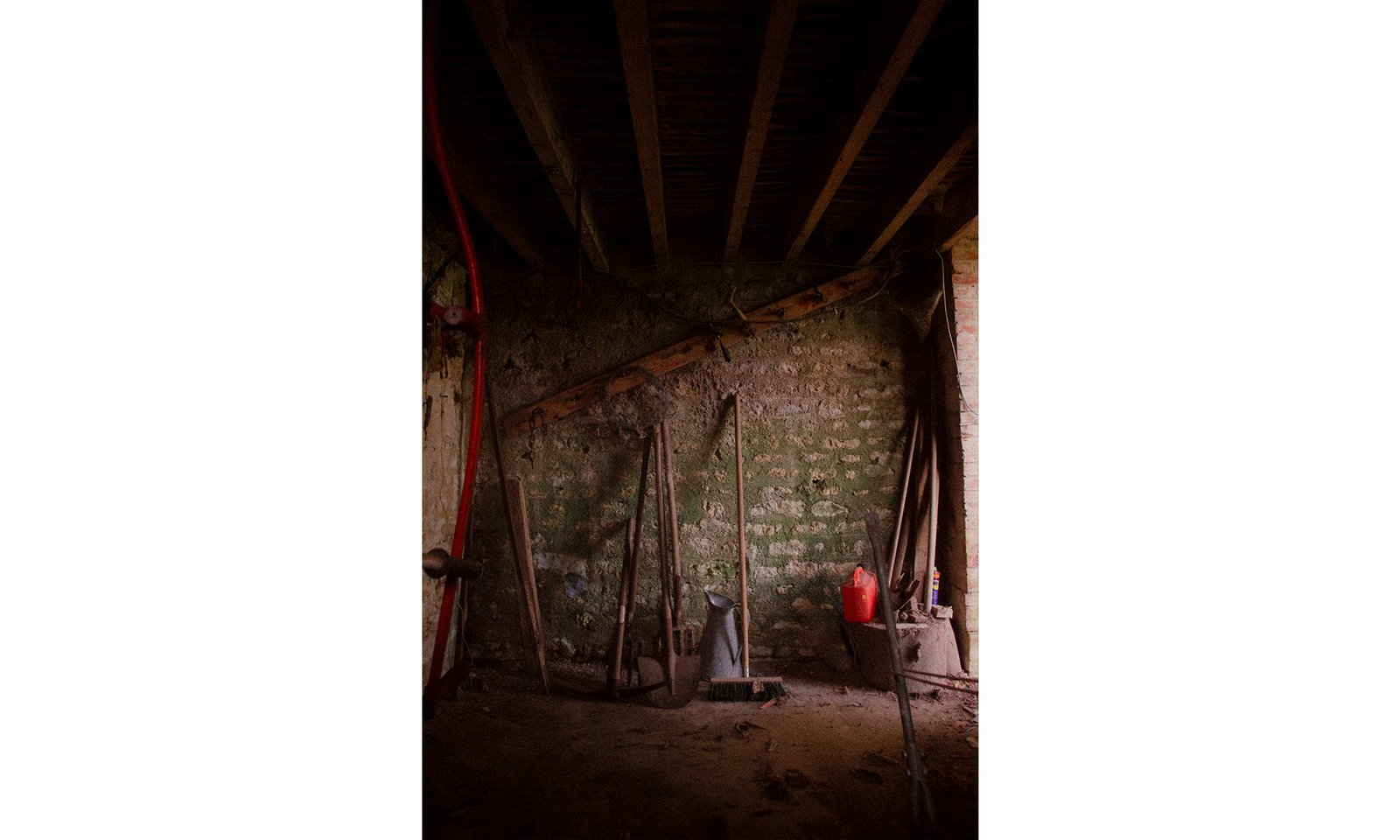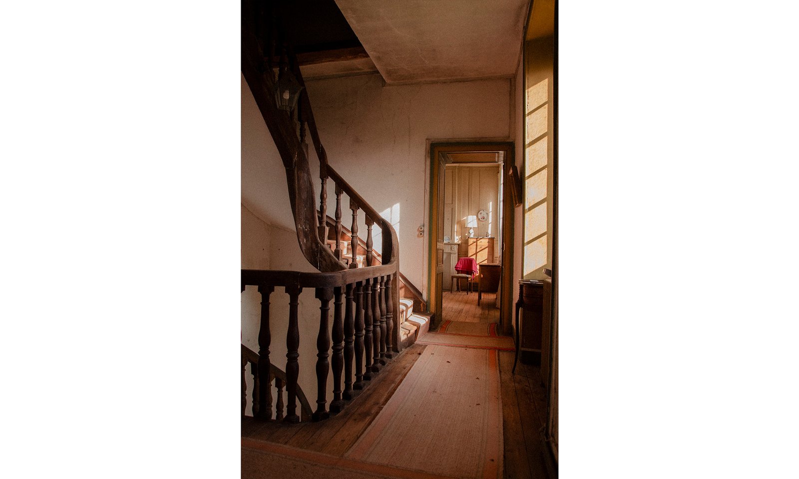 - L'entrée Sud donne accès à un escalier quart tournant en bois, recouvert d'un tapis ainsi qu'un petit accès à la cave.