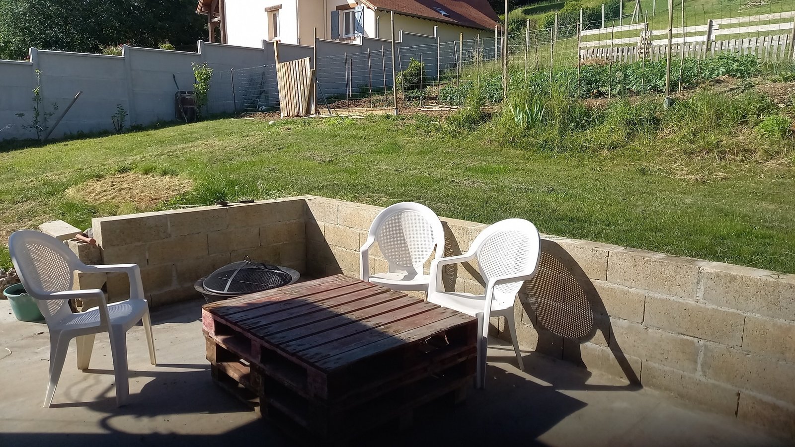 A l'arrière, une terrasse béton/Parpaings, grand potager ,