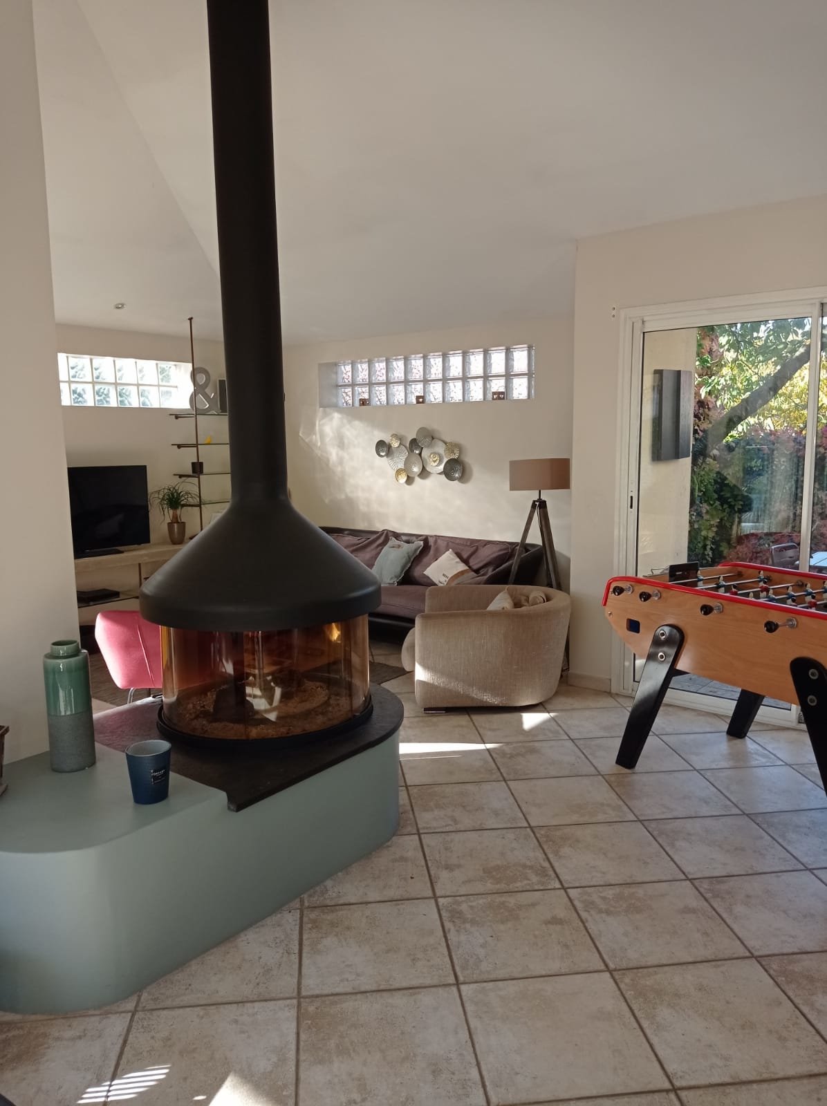 - salon/salle à manger de 60 m² avec grande hauteur sous plafond, larges baies vitrées, cheminée suspendue, décoration moderne style industriel