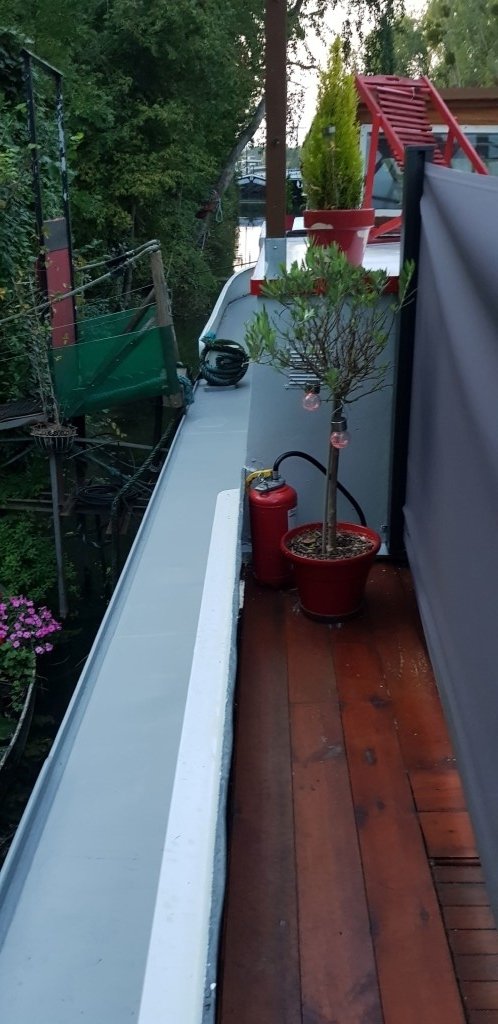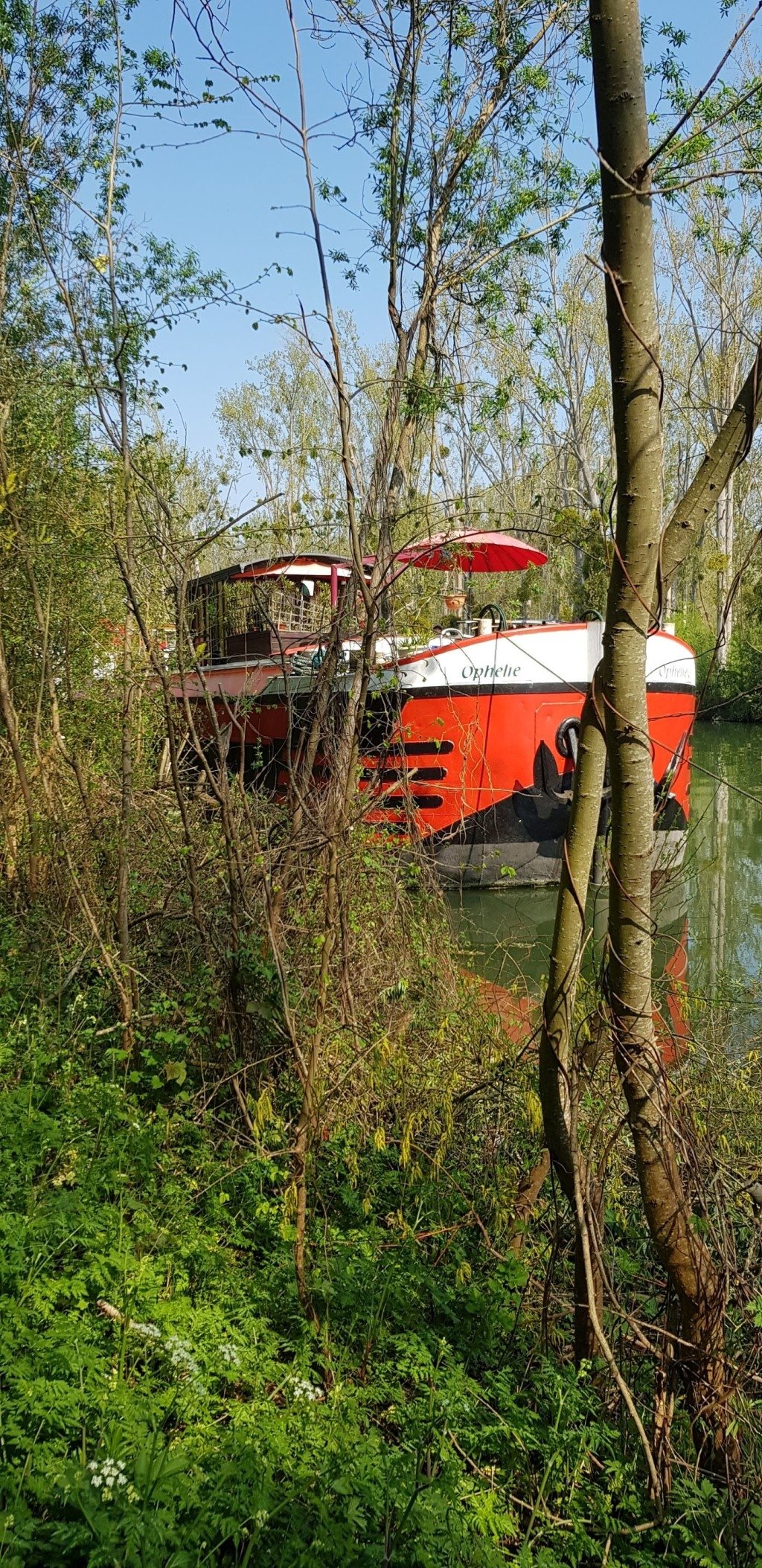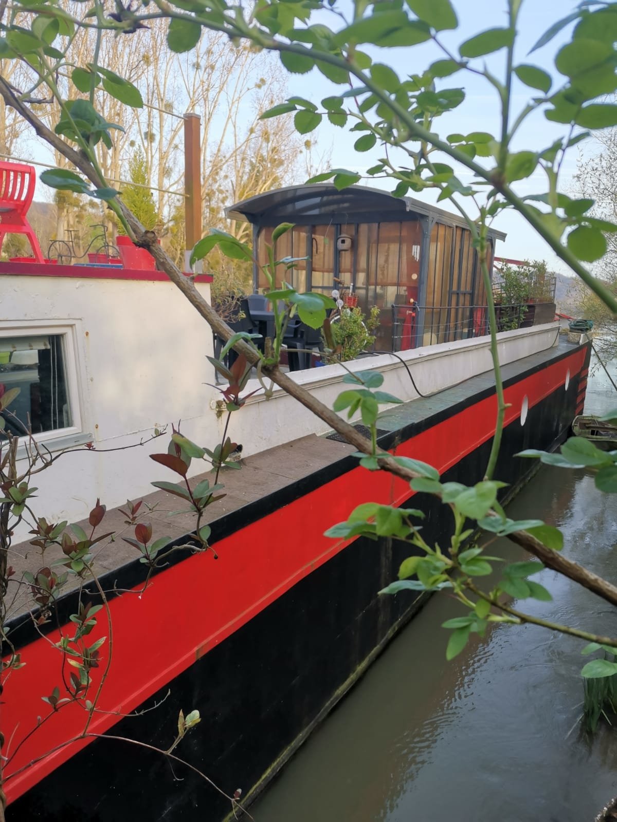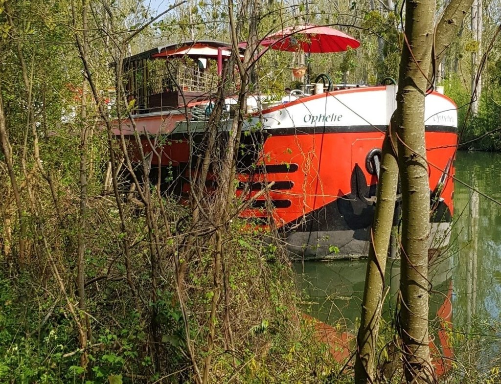 Jolie péniche avec vue sur la Seine et un chemin de halage.