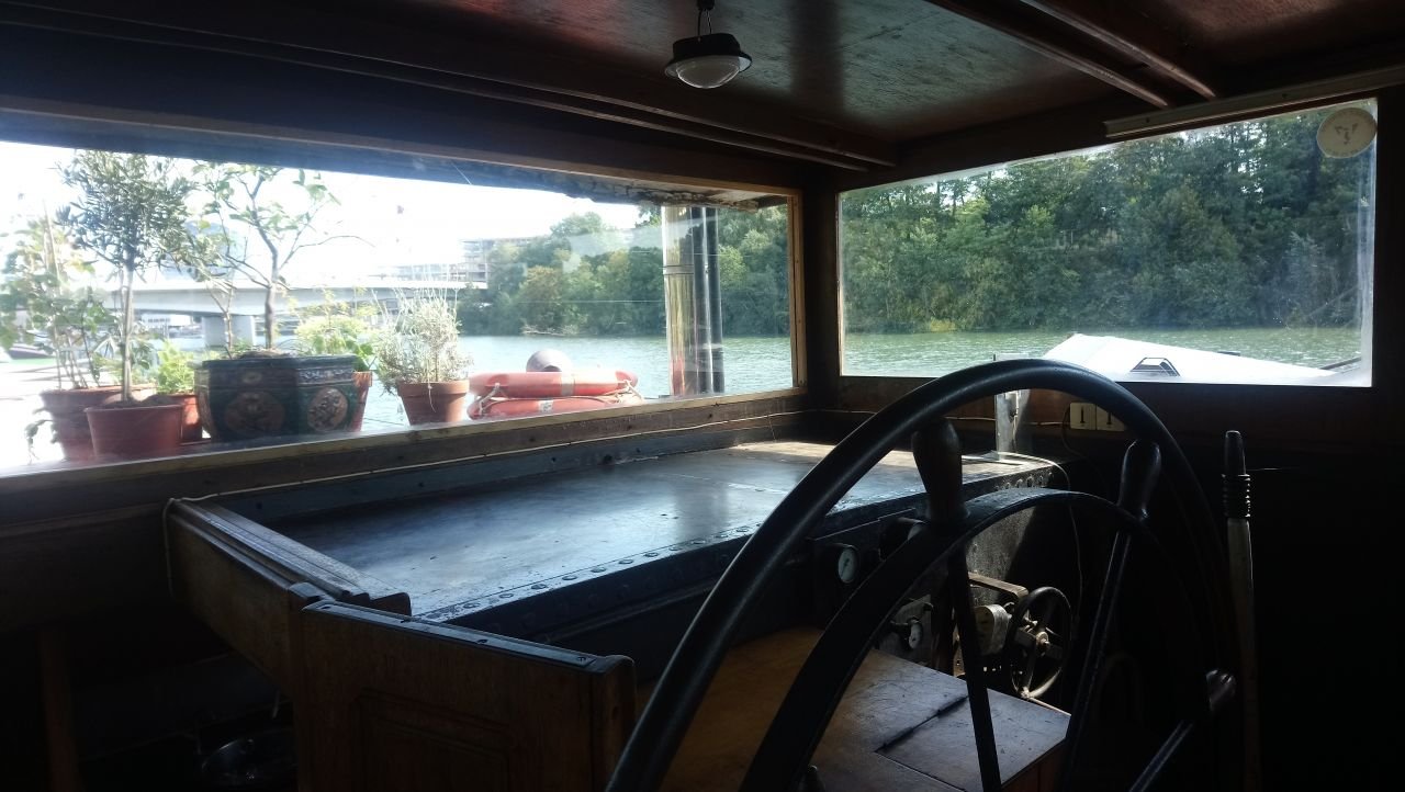 - d'une entrée/timonerie avec le gouvernail d'époque, les leviers et tableaux de commande de navigation.