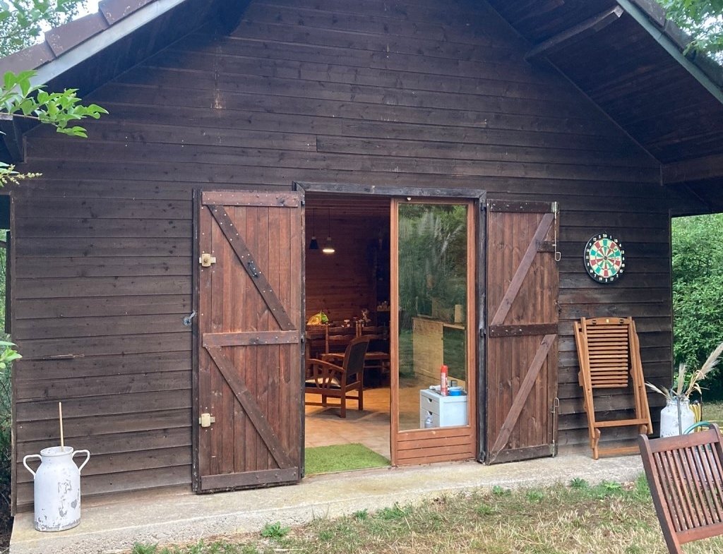 - Chalet en bois de 20m2 avec coin salon, cuisine ouverte (vintage, évier faïence marron...), chambre attenante en contre-bas avec terrasse, vue sur le bois