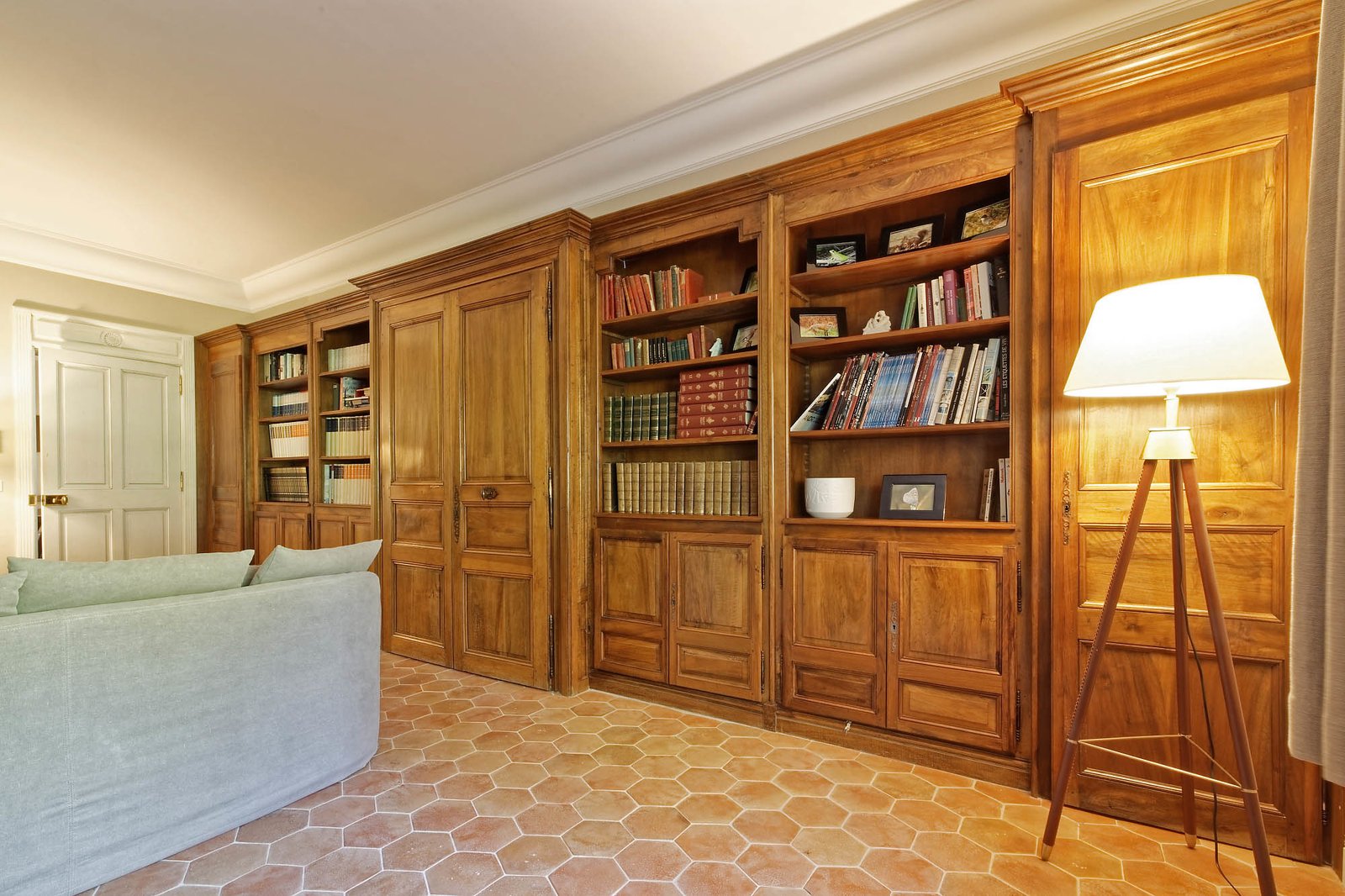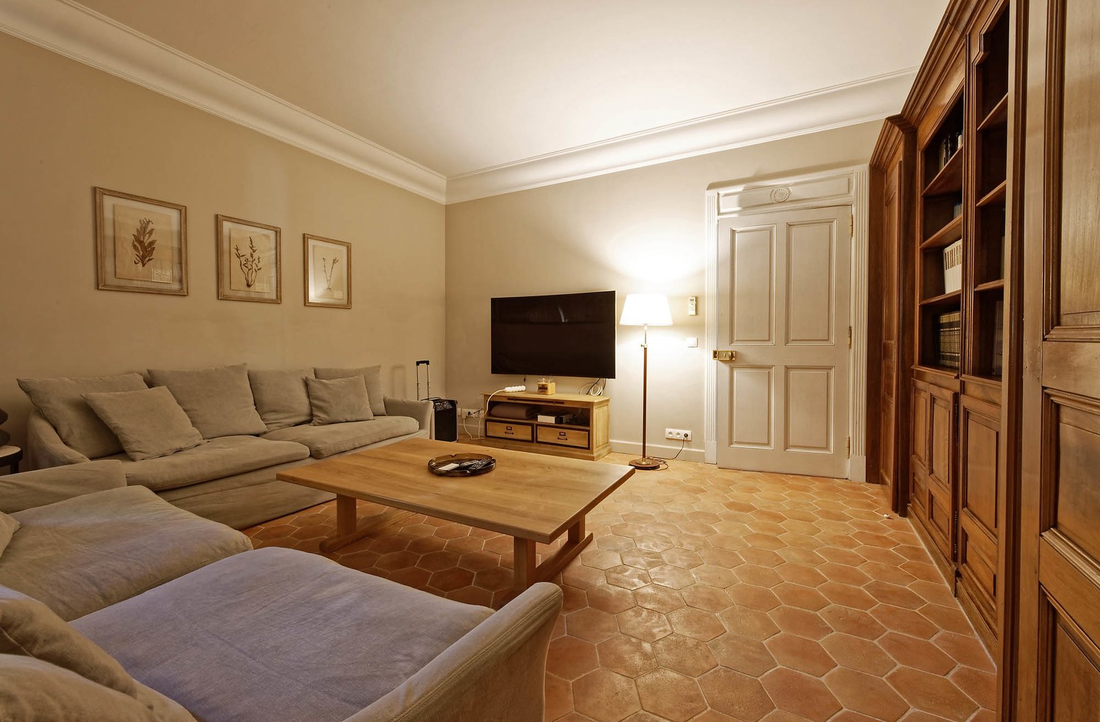• Salon-bibliothèque avec grande TV et canapés
