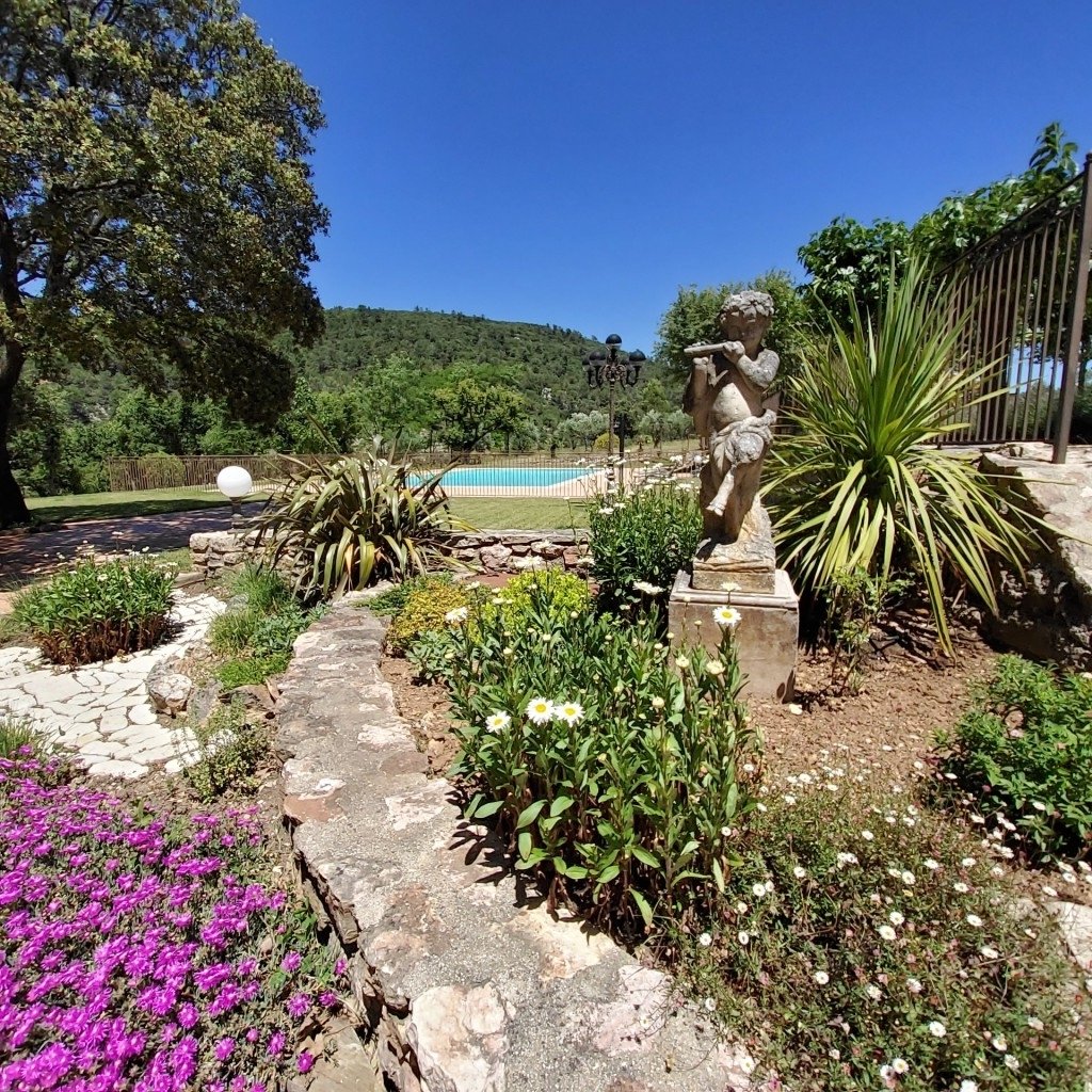 D’extérieurs aménagés et végétalisés : une piscine entourée de pelouse, un parc ombragé par de grands pins/chênes, un verger, et de grandes terrasses aménagées