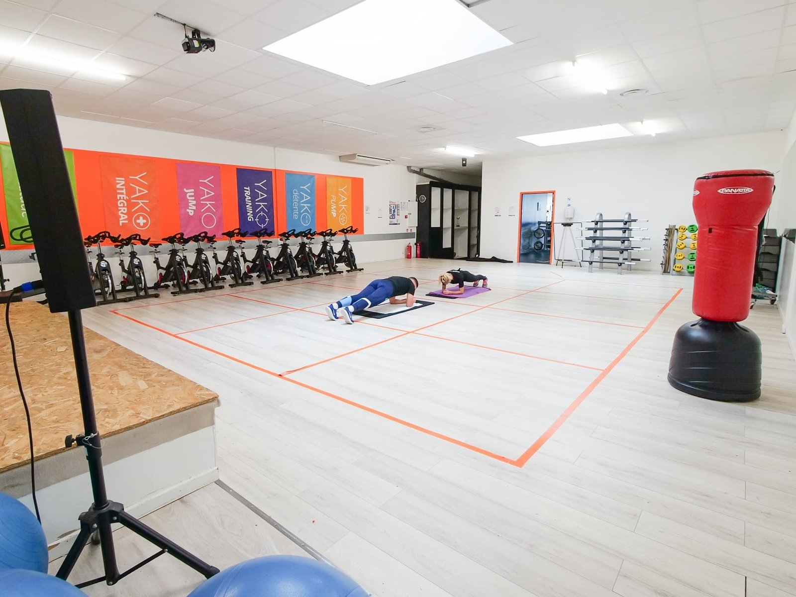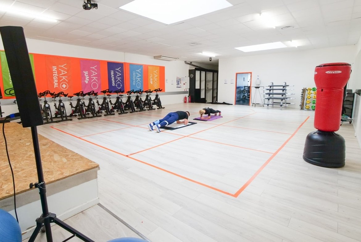 À l'étage : une salle de cours collectifs de 250 m² et une salle équipée de bancs, barres et haltères.