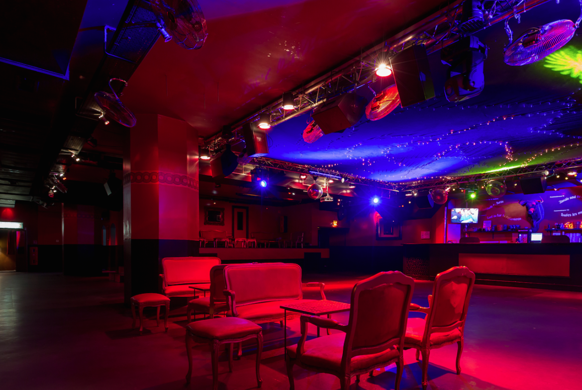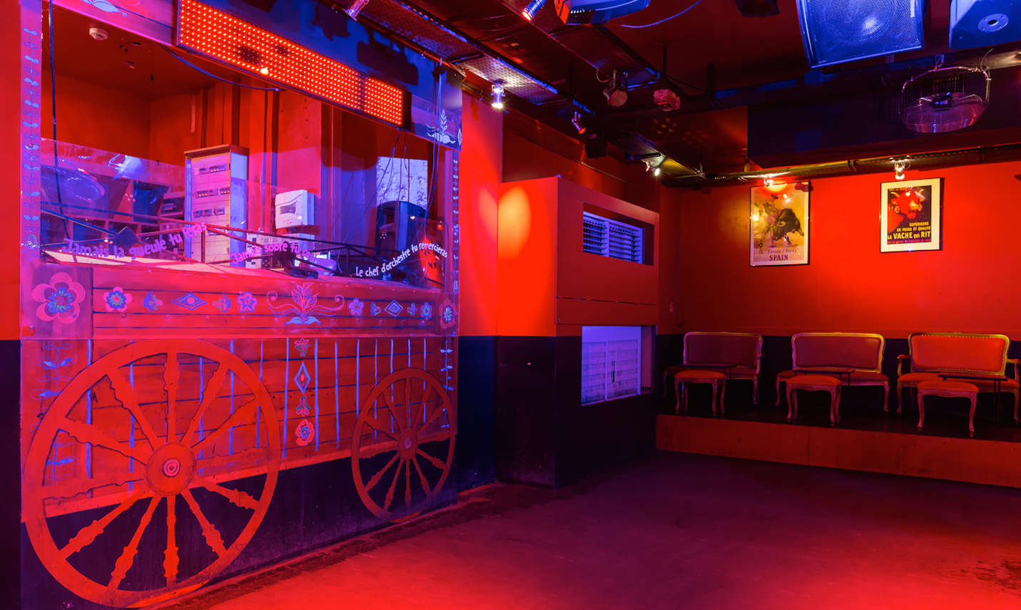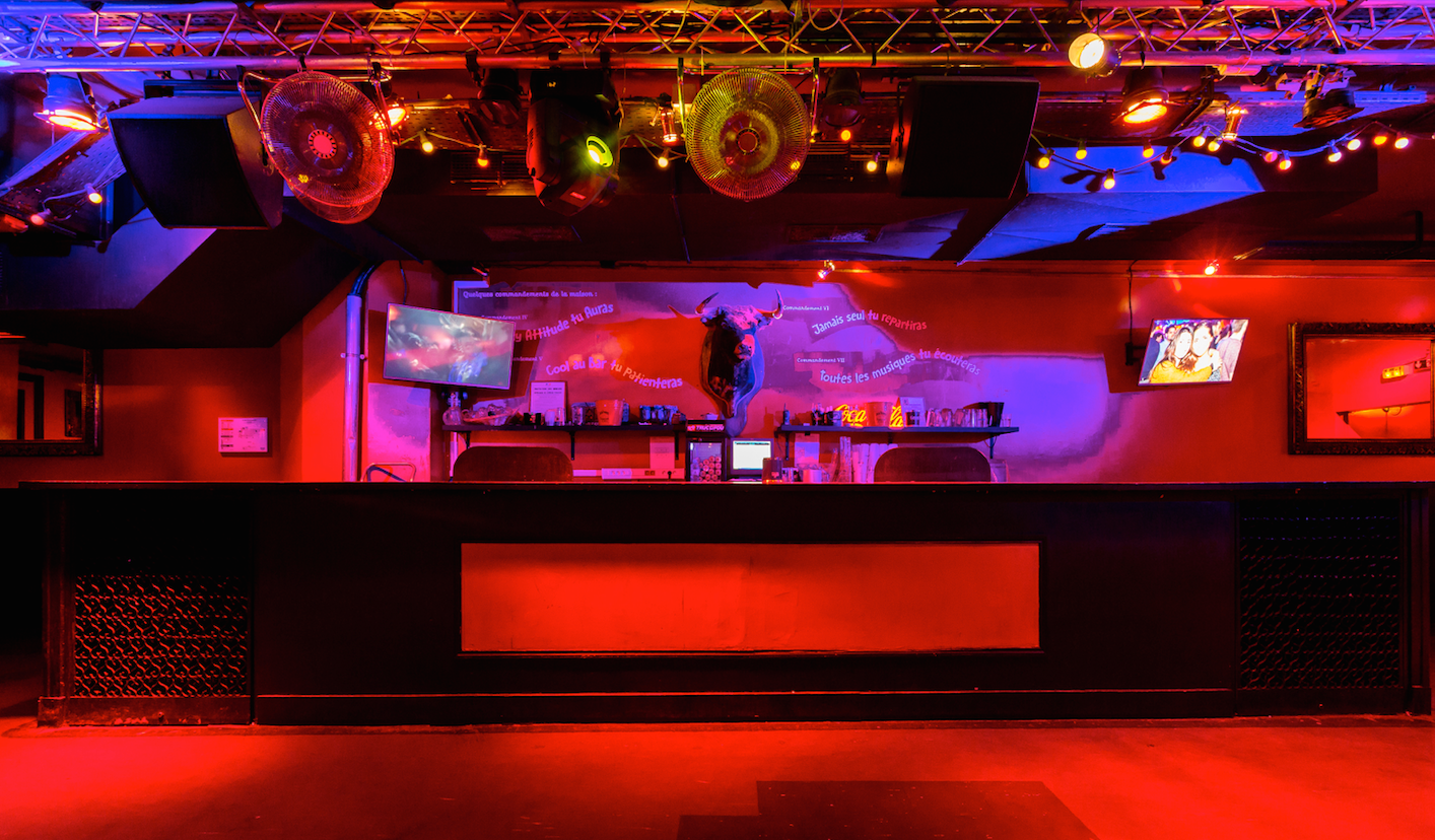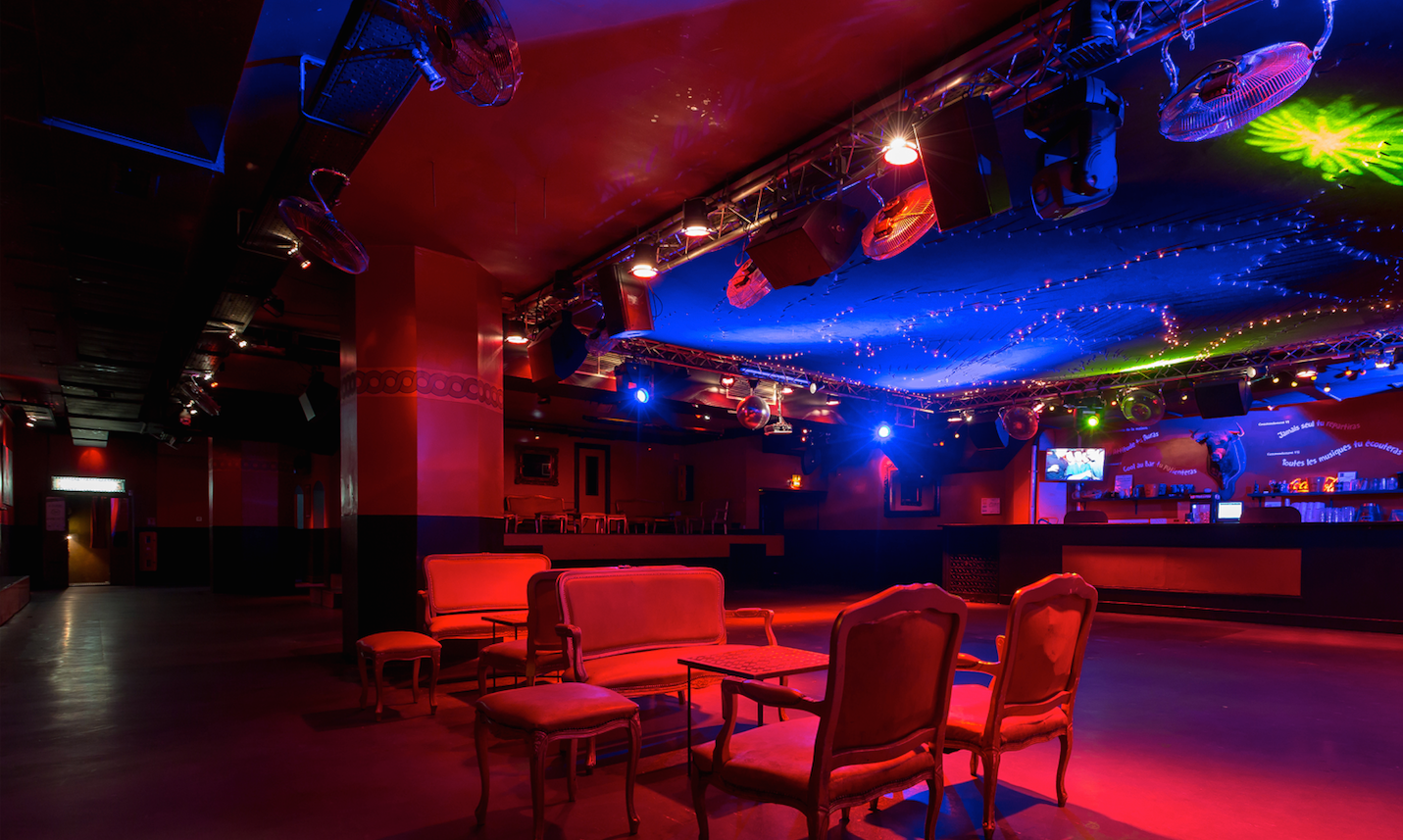 Une grande salle de 317 m² avec un bar (avec des toilettes, une cabine DJ, un photomaton tabobine, une scène/estrade, du mobilier).