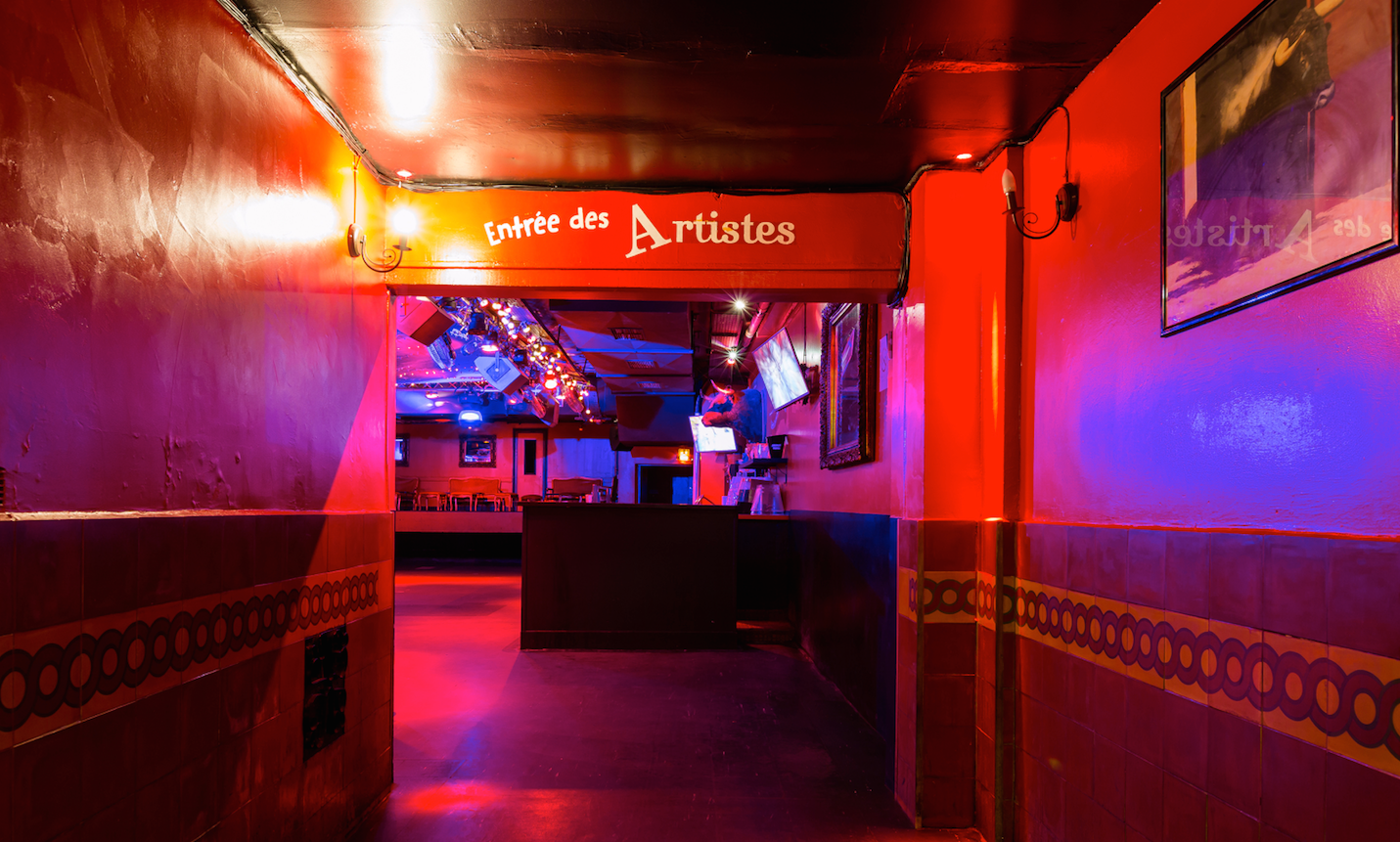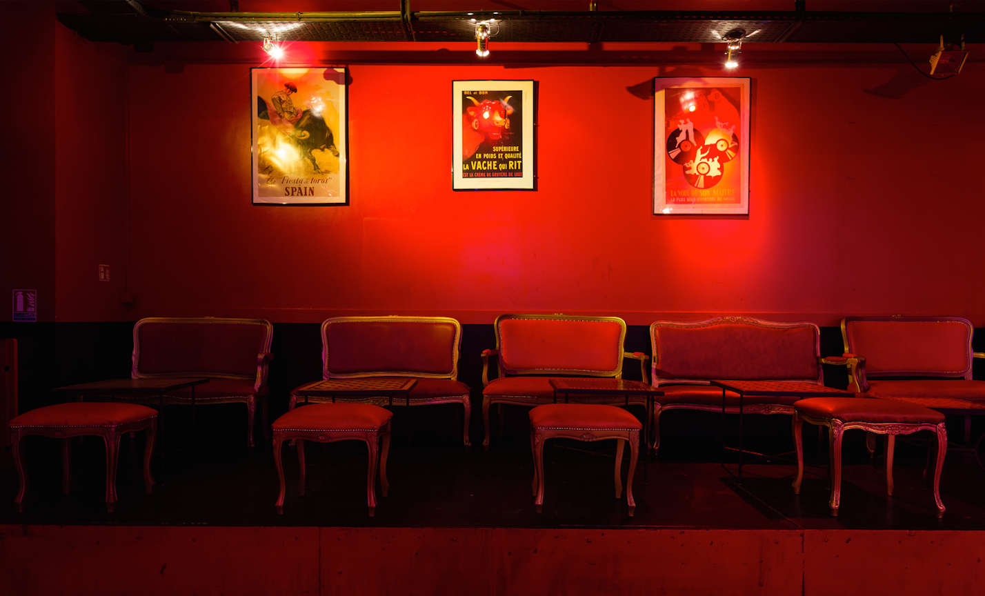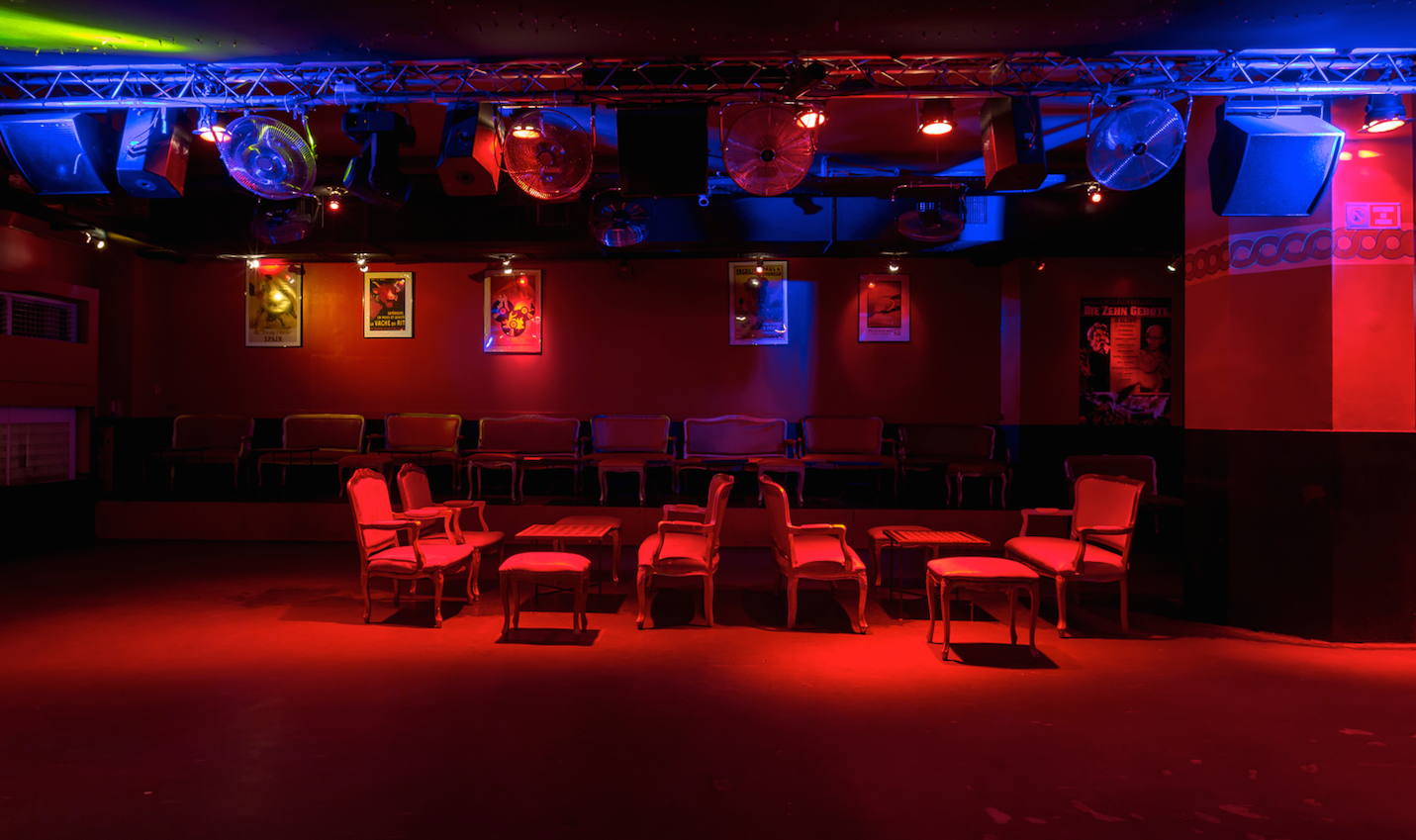 Une grande salle de 317 m² avec un bar (avec des toilettes, une cabine DJ, un photomaton tabobine, une scène/estrade, du mobilier).